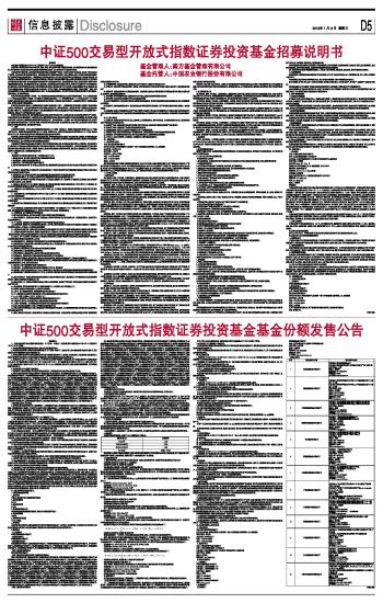 基金管理人:南方基金管理有限公司 基金托管人:中国农业银行股份有限公司 重要提示 本基金经中国证监会2012年12月21日证监许可[2012]1727号文核准募集。 基金管理人保证招募说明书的内容真实、准确、完整。本招募说明书经中国证监会核准,但中国证监会对本基金募集的核准,并不表明其对本基金的价值和收益做出实质性判断或保证,也不表明投资于本基金没有风险。 本基金投资于证券市场,基金净值会因为证券市场波动等因素产生波动,投资者在投资本基金前,应全面了解本基金的产品特性,充分考虑自身的风险承受能力,并承担基金投资中出现的各类风险,包括:因政治、经济、社会等环境因素对证券价格产生影响而形成的系统性风险,个别证券特有的非系统性风险,由于基金投资者连续大量赎回基金产生的流动性风险,基金管理人在基金管理实施过程中产生的基金管理风险。同时由于本基金是跟踪中证500指数的交易型开放式基金,投资本基金可能遇到的风险还包括:标的指数回报与股票市场平均回报偏离的风险、标的指数波动的风险、基金投资组合回报与标的指数回报偏离的风险、标的指数变更的风险、基金份额二级市场交易价格折溢价的风险、参考IOPV决策和IOPV计算错误的风险、退市风险、投资者申购失败的风险、投资者赎回失败的风险、退补现金替代方式的风险、基金份额赎回对价的变现风险、第三方机构服务的风险、管理风险与操作风险、技术风险、不可抗力等等。本基金被动跟踪标的指数“中证500指数”,因此,本基金的业绩表现与中证500指数的表现密切相关。同时,本基金为股票型基金,其长期平均风险和预期收益率高于混合型基金、债券型基金、及货币市场基金。 投资者申购的基金份额当日可卖出,当日未卖出的基金份额在份额交收成功之前不得卖出和赎回;即在目前结算规则下,T日申购的基金份额当日可卖出,T日申购当日未卖出的基金份额,T+1日不得卖出和赎回,T+1日交收成功后T+2日可卖出和赎回。因此为投资者办理申购业务的代理券商若发生交收违约,将导致投资者不能及时、足额获得申购当日未卖出的基金份额,投资者的利益可能受到影响。 投资者投资本基金时需具有上海证券交易所A股账户或基金账户。其中,上海证券交易所基金账户只能进行基金的现金认购和二级市场交易,如投资者需要使用中证500指数成份股中的上海证券交易所上市股票参与网下股票认购或基金的申购、赎回,则应开立上海证券交易所A股账户;如投资者需要使用中证500指数成份股中的深圳证券交易所上市股票参与网下股票认购,则还应开立深圳证券交易所A股账户。 投资者在投资本基金之前,请仔细阅读本基金的招募说明书和基金合同,全面认识本基金的风险收益特征和产品特性,并充分考虑自身的风险承受能力,理性判断市场,谨慎做出投资决策。基金的过往业绩并不预示其未来表现。基金管理人承诺以恪尽职守、诚实信用、谨慎勤勉的原则管理和运用基金财产,但不保证基金一定盈利,也不向投资者保证最低收益。基金管理人提醒投资者基金投资的“买者自负”原则,在投资者作出投资决策后,基金运营状况、基金份额上市交易价格波动与基金净值变化引致的投资风险,由投资者自行负责。 一、 绪言 本招募说明书依据《中华人民共和国证券投资基金法》(以下简称《基金法》)、《证券投资基金运作管理办法》(以下简称《运作办法》)、《证券投资基金销售管理办法》(以下简称《销售办法》)、《证券投资基金信息披露管理办法》(以下简称《信息披露办法》)、以及《中证500交易型开放式指数证券投资基金基金合同》编写。 基金管理人承诺本招募说明书不存在任何虚假记载、误导性陈述或者重大遗漏,并对其真实性、准确性、完整性承担法律责任。本基金是根据本招募说明书所载明的资料申请募集的。本基金管理人没有委托或授权任何其他人提供未在本招募说明书中载明的信息,或对本招募说明书作任何解释或者说明。 本招募说明书根据本基金的基金合同编写,并经中国证监会核准。基金合同是约定基金当事人之间权利、义务的法律文件。基金投资人自依基金合同取得基金份额,即成为基金份额持有人和本基金合同的当事人,其持有基金份额的行为本身即表明其对基金合同的承认和接受,并按照《基金法》、基金合同及其他有关规定享有权利、承担义务。基金投资人欲了解基金份额持有人的权利和义务,应详细查阅基金合同。 二、 释义 《招募说明书》中除非文意另有所指,下列词语具有如下含义: 1、基金或本基金:指中证500交易型开放式指数证券投资基金 2、基金管理人:指南方基金管理有限公司 3、基金托管人:指中国农业银行股份有限公司 4、基金合同或本基金合同:指《中证500交易型开放式指数证券投资基金基金合同》及对本基金合同的任何有效修订和补充 5、托管协议:指基金管理人与基金托管人就本基金签订之《中证500交易型开放式指数证券投资基金托管协议》及对该托管协议的任何有效修订和补充 6、招募说明书:指《中证500交易型开放式指数证券投资基金招募说明书》及其定期的更新 7、基金份额发售公告:指《中证500交易型开放式指数证券投资基金基金份额发售公告》 8、法律法规:指中国现行有效并公布实施的法律