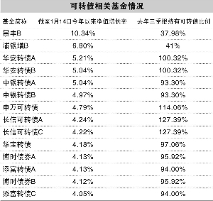 证券时报记者 杨磊 2013年新年以来,转债市场走牛,截至1月15日,天相转债指数今年以来上涨超过4%,转债基金和重仓转债的杠杆债券基金明显受益,其中大成景丰B的单位净值今年前7个交易日就大涨10.34%,截至1月15日,价格最大上涨幅度达10.99%。 据悉,景丰B的母基金大成景丰在2012年三季度末重仓持有可转债,占该基金资产净值的37.98%,特别是重仓持有了中行转债、石化转债和工行转债,三大品种分别持有13.09%、12.22%和7.26%,石化转债今年以来上涨6.04%,工行转债的涨幅也达到了4.62%。 业内专家分析,景丰B之所以单位净值能够大涨超过10%,除了重仓持有转债大涨之外,还有高杠杆的原因,该基金初始杠杆为3.33倍,实际杠杆超过了4倍。 另一只重仓转债的杠杆债基浦银增B也有不错的表现,截至1月14日,该基金今年以来净值上涨6.8%,该基金的母基金在2012年三季度末重仓持有了41%的可转债。 专门投资转债的普通开放式基金今年以来业绩也十分优异,截至1月14日,有11只转债基金今年以来净值增长幅度超过了4%,其中华安转债A、华安转债B和中银转债A涨幅都超过了5%,另有9只可转债基金的净值增长率在4%到5%之间。 华安转债A和B今年以来业绩领先,主要原因在于债券投资比例高和所重仓的重工转债表现优异。2012年基金三季报显示,可转债占华安转债A和B净资产的100.32%,该基金的第二重仓债券品种重工转债占比为20.07%,重工转债在1月14日大涨了5.22%,今年以来的上涨幅度接近了9%,大大提升了华安转债A和B今年以来的投资业绩。 本版导读: