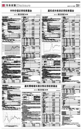 基金管理人:嘉实基金管理有限公司 基金托管人:中国农业银行股份有限公司 报告送出日期:2013年1月21日 §1 重要提示 基金管理人的董事会及董事保证本报告所载资料不存在虚假记载、误导性陈述或重大遗漏,并对其内容的真实性、准确性和完整性承担个别及连带责任。 基金托管人中国农业银行股份有限公司根据本基金合同规定,于2013年1月15日复核了本报告中的财务指标、净值表现和投资组合报告等内容,保证复核内容不存在虚假记载、误导性陈述或者重大遗漏。 基金管理人承诺以诚实信用、勤勉尽责的原则管理和运用基金资产,但不保证基金一定盈利。 基金的过往业绩并不代表其未来表现。投资有风险,投资者在作出投资决策前应仔细阅读本基金的招募说明书。 本报告期中的财务资料未经审计。 本报告期自2012年10月1日起至2012年12月31日止。 §2 基金产品概况 ■ §3主要财务指标和基金净值表现 3.1主要财务指标 单位:人民币元 ■ 注:(1)本期已实现收益指基金本期利息收入、投资收益、其他收入(不含公允价值变动收益)扣除相关费用后的余额,本期利润为本期已实现收益加上本期公允价值变动收益。(2)上述基金业绩指标不包括持有人认购或交易基金的各项费用,计入费用后实际收益水平要低于所列数字。 3.2 基金净值表现 3.2.1 本报告期基金份额净值增长率及其与同期业绩比较基准收益率的比较 ■ 3.2.2 自基金合同生效以来基金份额累计净值增长率历史走势对比图 ■ 图:嘉实丰和价值封闭累计份额净值增长率的历史走势对比图 (2002年3月22日至2012年12月31日) 注:按基金合同约定,本基金自基金合同生效日起3个月内为建仓期。建仓期结束时本基金的各项投资比例符合基金合同(七、(四)投资组合)的有关约定:(1)本基金投资于股票、债券的比重不低于基金资产总值的80%,投资于国债的比重不低于基金资产净值的20%;(2)本基金投资于一家上市公司的股票,不超过基金资产净值的10%;(3)本基金与由本基金管理人管理的其他基金持有一家公司发行的证券总和,不超过该证券的10%;(4)本基金股票投资组合的平均B/P值高于沪深A股市场的平均B/P值;(5)遵守中国证监会规定的其他比例限制。 §4 管理人报告 4.1 基金经理(或基金经理小组)简介 ■ 注:(1)任职日期、离任日期指公司作出决定后公告之日;(2)证券从业的含义遵从行业协会《证券业从业人员资格管理办法》的相关规定。 4.2 管理人对报告期内本基金运作遵规守信情况的说明 报告期内,本基金管理人严格遵循了《证券法》、《证券投资基金法》及其各项配套法规、《丰和价值证券投资基金基金合同》和其他相关法律法规的规定,本着诚实信用、勤勉尽责的原则管理和运用基金资产,在严格控制风险的基础上,为基金份额持有人谋求最大利益。本基金运作管理符合有关法律法规和基金合同的规定和约定,无损害基金份额持有人利益的行为。 4.3 公平交易专项说明 4.3.1 公平交易制度的执行情况 报告期内,基金管理人严格执行证监会《证券投资基金管理公司公平交易制度指导意见》和公司内部公平交易制度,各投资组合按投资管理制度和流程独立决策,并在获得投资信息、投资建议和实施投资决策方面享有公平的机会;通过完善交易范围内各类交易的公平交易执行细则、严格的流程控制、持续的技术改进,确保公平交易原则的实现;通过IT系统和人工监控等方式进行日常监控,公平对待旗下管理的所有投资组合。 4.3.2 异常交易行为的专项说明 报告期内,本基金未发生异常交易行为。 4.4报告期内基金的投资策略和业绩表现的说明 4.4.1 报告期内基金投资策略和运作分析 报告期内,市场先跌后涨,总体出现较大幅度反弹市,上证50指数大幅跑赢沪深300指数,而沪深300大幅跑赢中证500。 从经济方面看,我们认为:第一,国内宏观经济出现了复苏迹象,企业盈利出现显著回升,市场对银行资产质量和息差的担忧都得到缓解,投资者的风险偏好改善;第二,改革预期加强,“十八大”尘埃落定,市场对改革继续推进的预期加强,新型城镇化政策主线清晰;第三,外围环境趋暖,美国推出 QE3 及欧债危机阶段性缓解使全球风险偏好上升,四季度后半期美国、欧洲、日本、韩国、香港等股市普遍涨幅较好。从资金面的供求状况看,我们发现也对股市有利:第一,QFII、RQFII等资金流入增加,中长线增量资金效应,发掘低估值蓝筹板块配置价值;第二,企业首发及再融资速度的放缓,阶段性缓解了资金市场的压力。综观四季度,周期性板块大幅度跑赢,其中银行、房地产、汽车、建筑建材等板块表现较好,而消费和成长板块则由于业绩缺乏弹性、行业突发事件(塑化剂及康美土地风波)、限售解禁压力、业绩下调等原因,明显表现较弱。 本基金报告期内继续超配地产、医药、传媒,增配了银行、水泥等周期股,减持了部分小市值股票、LED行业、受行业突发事件影响的消费股。 4.4.2 报告期内基金的业绩表现 截至本报告期末本基金份额净值为0.9211元,本报告期基金份额净值增长率为2.42%。 4.5 管理人对宏观经济、证券市场及行业走势的简要展望 展望2013年第一季度,我们认为:第一,中国经济将呈现GDP增速低位缓慢上升,投资增速回升而出口增速依旧处于低位,就业压力将进一步显现,企业盈利尽管回升,但仍然在低位。第二,受制于政府换届和各级政府财政压力,