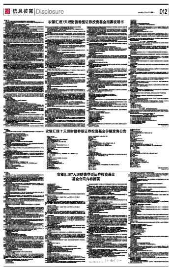 (上接D9版) (1)现场开会 在现场开会的方式下,首先由大会主持人按照规定程序宣布会议议事程序及注意事项,确定和公布监票人,然后由大会主持人宣读提案,经讨论后进行表决,经合法执业的律师见证后形成大会决议。 大会由召集人授权代表主持。基金管理人为召集人的,其授权代表未能主持大会的情况下,由基金托管人授权代表主持;如果基金管理人和基金托管人授权代表均未能主持大会,则由出席大会的基金份额持有人和代理人以所代表的基金份额50%以上多数选举产生一名代表作为该次基金份额持有人大会的主持人。 召集人应当制作出席会议人员的签名册。签名册载明参加会议人员姓名(或单位名称)、身份证号码、持有或代表有表决权的基金份额数量、委托人姓名(或单位名称)等事项。 (2)通讯方式开会 在通讯表决开会的方式下,首先由召集人提前30日公布提案,在所通知的表决截止日期后第2个工作日在公证机关及监督人的监督下由召集人统计全部有效表决并形成决议。如监督人经通知但拒绝到场监督,则在公证机关监督下形成的决议有效。 3.基金份额持有人大会不得对未事先公告的议事内容进行表决。 G、决议形成的条件、表决方式、程序 1.基金份额持有人所持每一基金份额享有平等的表决权。 2.基金份额持有人大会决议分为一般决议和特别决议: (1)一般决议 一般决议须经出席会议的基金份额持有人(或其代理人)所持表决权的50%以上通过方为有效,除下列(2)所规定的须以特别决议通过事项以外的其他事项均以一般决议的方式通过; (2)特别决议 特别决议须经出席会议的基金份额持有人(或其代理人)所持表决权的三分之二以上(含三分之二)通过方为有效;涉及更换基金管理人、更换基金托管人、转换基金运作方式、终止基金合同必须以特别决议通过方为有效。 3.基金份额持有人大会决定的事项,应当依法报中国证监会核准或者备案,并予以公告。 4.采取通讯方式进行表决时,除非在计票时有充分的相反证据证明,否则表面符合法律法规和会议通知规定的书面表决意见即视为有效的表决,表决意见模糊不清或相互矛盾的视为弃权表决,但应当计入出具书面意见的基金份额持有人所代表的基金份额总数。 5.基金份额持有人大会采取记名方式进行投票表决。 6.基金份额持有人大会的各项提案或同一项提案内并列的各项议题应当分开审议、逐项表决。 H、计票 1.现场开会 (1)如基金份额持有人大会由基金管理人或基金托管人召集,则基金份额持有人大会的主持人应当在会议开始后宣布在出席会议的基金份额持有人和代理人中推举两名基金份额持有人代表与大会召集人授权的一名监督员共同担任监票人;如大会由基金份额持有人自行召集,基金份额持有人大会的主持人应当在会议开始后宣布在出席会议的基金份额持有人和代理人中推举两名基金份额持有人代表与基金管理人、基金托管人授权的一名监督员共同担任监票人;但如果基金管理人和基金托管人的授权代表未出席,则大会主持人可自行选举三名基金份额持有人代表担任监票人。 (2)监票人应当在基金份额持有人表决后立即进行清点,由大会主持人当场公布计票结果。 (3)如大会主持人对于提交的表决结果有异议,可以对投票数进行重新清点;如大会主持人未进行重新清点,而出席大会的基金份额持有人或代理人对大会主持人宣布的表决结果有异议,其有权在宣布表决结果后立即要求重新清点,大会主持人应当立即重新清点并公布重新清点结果。重新清点仅限一次。 2.通讯方式开会 在通讯方式开会的情况下,计票方式为:由大会召集人授权的两名监票人在监督人派出的授权代表的监督下进行计票,并由公证机关对其计票过程予以公证;如监督人经通知但拒绝到场监督,则大会召集人可自行授权3名监票人进行计票,并由公证机关对其计票过程予以公证。 I、基金份额持有人大会决议报中国证监会核准或备案后的公告时间、方式 1.基金份额持有人大会通过的一般决议和特别决议,召集人应当自通过之日起5日内报中国证监会核准或者备案。基金份额持有人大会决定的事项自中国证监会依法核准或者出具无异议意见之日起生效。 2.生效的基金份额持有人大会决议对全体基金份额持有人、基金管理人、基金托管人均有约束力。基金管理人、基金托管人和基金份额持有人应当执行生效的基金份额持有人大会决议。 3.基金份额持有人大会决议应自生效之日起2日内在指定媒体公告。如果采用通讯方式进行表决,在公告基金份额持有人大会决议时,必须将公证书全文、公证机构、公证员姓名等一同公告。 J、法律法规或监管部门对基金份额持有人大会另有规定的,从其规定。 (三)基金收益分配原则、执行方式 A、收益分配原则 本基金收益分配应遵循下列原则: 1、本基金同一类别内的每份基金份额享有同等分配权; 2、本基金收益分配方式为红利再投资,免收再投资的费用; 3、本基金根据各类基金份额的每日收益情况,以每万份基金净收益为基准,为投资人每日计算当日收益并分配,在每个运作期满集中支付。投资人当日收益分配的计算保留到小数点后 2 位,第三位截位。截位部分收益,按截位尾数大小排序依次分配0.01元,直至实际分配收益与当日基金总收益一致,如果尾数相同则由注册登记系统随机分