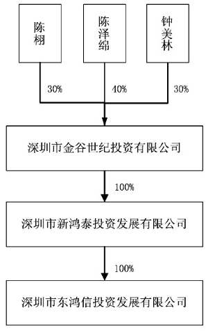 第二节 信息披露义务人介绍 一、信息披露义务人基本情况 (一)公司名称: 深圳市金谷世纪投资有限公司 (二)注册地址: 深圳市福田区福华三路与金田路交汇处卓越世纪中心4号楼2610 (三)法定代表人:陈泽绵 (四)注册资本:10000万元 (五)企业法人营业执照注册号: 440301105015566 (六)企业类型:有限责任公司 (七)主要经营范围: 投资兴办实业(具体项目另行申报);在合法取得土地使用权范围内从事房地产开发经营;国内贸易(法律、行政法规、国务院决定规定在登记前须经批准的项目除外);经营进出口业务(法律、行政法规、国务院决定禁止的项目除外,限制的项目须取得许可后方可经营);自有物业租赁,物业服务(取得相关行政主管部门颁发的资质证书后方可经营);信息咨询(不含人才中介服务和其它限制项目);股权投资 (八)经营期限: 2010年10月28日至2030年10月28日 (九)税务登记证号码:440300564237652 (十)通讯地址:深圳市福田区福华三路与金田路交汇处卓越世纪中心4号楼2610 (十一)股东:陈栩、陈泽绵、钟美林 (十二)信息披露义务人的股权控制关系如下: ■ (十三)截止本报告书签署之日,信息披露义务人的股东、董事、监事、高管等与宝安地产及宝安地产第一大股东均无关联关系。 二、其他相关方的基本情况 (一)深圳新鸿泰于1994年10月27日注册成立,经营期限自1994年10月27日起至2044年10月18日止,注册资本2000万元,2011年度已年检,合法有效存续,经营范围主要包括投资兴办各类实业(具体项目另行申报);国内商业,物资供销业;信息咨询(以上不含专营、专卖商品及限制项目)。深圳新鸿泰的股东为信息披露义务人,出资比例100%。 (二)深圳东鸿信于1999年7月20日注册成立,经营期限自1999年7月20日起至2020年12月31日止,注册资本1000万元,2011年度已年检,合法有效存续,经营范围主要包括投资兴办实业(具体项目另行申报);国内商业、物资供销业(不含专营、专控、专卖商品);电脑及外部设备、通讯设备、生物工程的技术开发(不含医药及限制项目)。深圳东鸿信的股东为深圳新鸿泰,出资比例100%。 三、信息披露义务人董事、监事及高管的基本情况