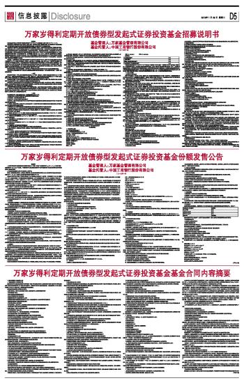 重要提示 本基金由基金管理人申请并经中国证监会证监许可[2012]1520号文核准募集,核准日期为2012年11月15日。 本基金管理人保证招募说明书的内容真实、准确、完整。本招募说明书经中国证监会核准,但中国证监会对本基金募集的核准,并不表明其对本基金的价值和收益作出实质性判断或保证,也不表明投资于本基金没有风险。 本基金投资于证券市场,基金净值会因为证券市场波动等因素产生波动,本基金在投资运作过程中可能面临各种风险,包括:因整体政治、经济、社会等环境因素对证券价格产生影响而形成的系统性风险,个别证券特有的非系统性风险,基金管理人在基金管理实施过程中产生的基金管理风险,本基金的特定风险等。本基金特定风险包括:1)本基金部分资产投资于中小企业私募债券,无法完全规避这类品种的流动性风险和信用风险;相对于不投资中小企业私募债的纯债基金而言,本基金预期风险水平相对更高。2)在本基金每年开放一次申购赎回,每次开放5-20个工作日,在非开放日基金份额持有人将面临不能赎回基金份额的风险。3)本基金开放期内单个开放日出现巨额赎回的,赎回的基金份额持有人有可能存在延缓支付赎回款项的风险,未赎回的基金份额持有人仍有可能承担短期内变现而带来的冲击成本对基金净资产产生的负面影响。4)基金份额持有人面临基金合同提前终止的风险。 本基金是一只债券型基金,投资于固定收益类资产的比例不低于基金资产的80%,投资于中小企业私募债券的比例不高于债券类资产的10%,本基金不投资股票,不直接在二级市场买入可转换债券、权证,但可以参与一级市场可转换债券(含可分离交易的可转换债券)的申购。本基金预期风险水平和预期收益将高于货币市场基金,低于混合型基金、股票型基金。投资有风险,投资人在进行投资决策前,请仔细阅读本基金的招募说明书和基金合同,全面认识本基金产品的风险收益特征,充分考虑投资人自身的风险承受能力,并对于认购(或申购)基金的意愿、时机、数量等投资行为作出独立决策。在投资人作出投资决策后,基金投资运作与基金净值变化引致的投资风险,由投资人自行负责。 基金的过往业绩并不预示其未来表现。基金管理人所管理的其它基金的业绩并不构成对本基金业绩表现的保证。 本基金管理人承诺依照恪尽职守、诚实信用、谨慎勤勉的原则管理和运用基金财产,但不保证投资本基金一定盈利,也不保证最低收益。 一、绪言 本招募说明书依据《中华人民共和国证券投资基金法》(以下简称《基金法》)、《证券投资基金运作管理办法》(以下简称《运作办法》)、《证券投资基金销售管理办法》(以下简称《销售办法》)、《证券投资基金信息披露管理办法》(以下简称《信息披露办法》)等有关法律法规以及《万家岁得利定期开放债券型发起式证券投资基金基金合同》编写。 本招募说明书阐述了万家岁得利定期开放债券型发起式证券投资基金的投资目标、策略、风险、费率等与投资人投资决策有关的全部必要事项,投资人在做出投资决策前应仔细阅读本招募说明书。 本基金管理人承诺本招募说明书不存在任何虚假记载、误导性陈述或者重大遗漏,并对其真实性、准确性、完整性承担法律责任。本基金是根据本招募说明书所载明的资料申请募集的。本基金管理人没有委托或授权任何其他人提供未在本招募说明书中载明的信息,或对本招募说明书作任何解释或者说明。 本招募说明书根据本基金的基金合同编写,并经中国证监会核准。基金合同是约定基金合同当事人之间权利、义务的法律文件。基金投资人自依基金合同取得基金份额即成为基金份额持有人和基金合同的当事人,其持有基金份额的行为本身即表明其对基金合同的承认和接受,并按照《基金法》、基金合同及其他有关规定享有权利、承担义务。基金投资人欲了解基金份额持有人的权利和义务,应详细查阅基金合同。 二、释义 在本招募说明书中,除非文意另有所指,下列词语或简称具有如下含义: 1、基金或本基金:指万家岁得利定期开放债券型发起式证券投资基金 2、基金管理人:指万家基金管理有限公司 3、基金托管人:指中国工商银行股份有限公司 4、基金合同、《基金合同》或本基金合同:指《万家岁得利定期开放债券型发起式证券投资基金基金合同》及对本基金合同的任何有效修订和补充 5、托管协议:指基金管理人与基金托管人就本基金签订之《万家岁得利定期开放债券型发起式证券投资基金托管协议》及对该托管协议的任何有效修订和补充 6、招募说明书:指《万家岁得利定期开放债券型发起式证券投资基金招募说明书》及其定期的更新 7、基金份额发售公告:指《万家岁得利定期开放债券型发起式证券投资基金基金份额发售公告》 8、法律法规:指中国现行有效并公布实施的法律、行政法规、规范性文件、司法解释、行政规章以及其他对基金合同当事人有约束力的决定、决议、通知等 9、《基金法》:指2003年10月28日经第十届全国人民代表大会常务委员会第五次会议通过,自2004年6月1日起实施的《中华人民共和国证券投资基金法》及颁布机关对其不时做出的修订 10、《销售办法》:指中国证监会2011年6月9日颁布、同年10月1日实施的《证券投资基金销售管理办法》及颁布