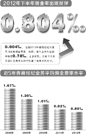 证券时报记者 伍泽琳 近期,券商经纪业务负责人或许能稍微松一口气,因为2008年以来处于持续下降状态的交易佣金费率在去年下半年终于反弹。 0.804%。,这是2012年券商经纪业务平均交易佣金费率。然而,去年上半年该数字却是0.78%。,由此可见,去年下半年交易佣金费率反弹才拉高了全年平均水平。 对此,业内人士表示,券商去年加快经纪业务转型,多地券商均参照成本佣金费率标准展业,减缓了佣金费率下滑势头。此外,融资融券业务的开展以及部分享受低佣的大户减少交易也助推了佣金费率企稳。 近5年首度逆转 作为影响券商传统经纪业务收入重要因素的交易佣金费率,一升一降无不牵动着行业的神经。 一份来自某中型券商的内部统计材料显示,此前证券公司的网点扩张加剧了佣金费率的下滑,自2008年至今,券商营业网点数量增加逾七成,佣金费率整体下跌近六成。2008年,平均佣金费率水平为1.67%。,此后一路下滑,2012年上半年降至0.78%。。与此同时,佣金费率之战让各券商疲于应对。 然而,中证协对证券公司2012年度经营数据的统计显示,114家证券公司去年全年实现代理买卖证券业务净收入504.07亿元。与此同时,据Wind数据统计显示,去年沪深两市的总成交额为31.32万亿元。据此粗略估算,去年券商经纪业务平均交易佣金费率为0.804%。。对此,业内人士表示,实际上券商经纪业务提供股票、基金、债券等多种产品交易服务,但是,除股票外其他交易产品的佣金费率普遍较低,成交额也较小,因为通常股票交易佣金费率水平在很大程度上反映了券商经纪业务的整体佣金率水平。 尽管2012年的佣金费率水平与2010年的1%。相比尚有距离,但与2011年的0.82%。已经非常接近。 “近期佣金费率确实回升了一些。”深圳某中型券商经纪业务总部相关业务人士表示,尤其是去年12月份股市走强,该公司大部分营业部当月扭亏为盈。 多重因素角力 “去年下半年,我们新开户的客户一律按照0.8%。的成本佣金收费。如果客户需要发送资讯服务套餐或者投顾业务服务的话,佣金费率都在1%。以上。”某大型券商总部负责营销的人士说。 而国海证券经纪业务相关人士也表示,新开户客户的佣金费率都不会低于0.8%。,“过去那种白菜价的佣金费率已经没有了。” 据了解,针对券商低佣揽客的恶性竞争行为,去年浙江、广东、北京、深圳等多个地区陆续出台了一系列指导意见,并征集当地券商营业部成本佣金费率数据。随后,多家证券公司都按照1.5%。~0.8%。的成本佣金费率开展业务。 实际上,因为争抢客户,券商之间曾频繁上演低佣揽客大战,0.3%。、0.5%。的白菜价曾经随处可见,2011年甚至还出现了零佣金的案例。 除了暂时偃旗息鼓的佣金大战让佣金费率持续下滑的势头急刹车外,去年发展势头凶猛的融资融券业务也为券商的平均佣金费率反弹增色不少。业内人士透露,融资融券的客户交易佣金费率一般高达3%。。尽管随着更多券商开展两融业务,该类交易佣金费率今年以来悄然下滑,但仍然高于普通的股票交易佣金费率。“今年,我们公司大力推进融资融券业务,在部分地区,两融交易佣金向公司总部申请后可以降至1.5%。。”某大型上市券商深圳营业部投资顾问透露。 此外,还有部分券商人士反映去年股市低迷,不少机构客户提前出场,反而助推平均佣金费率回升。 “我们平均佣金费率有所回升,主要是机构客户交易减少。”沪上某大型券商经纪业务相关人士透露,所谓的机构客户是指一些资产在千万元以上的投资者,这些资产量较大的投资者通常议价能力非常强,一般能享受0.5%。以下的佣金费率。 广东一家小型券商的营销总监对记者表示,过去市场竞争激烈的时候,只要资产量在百万以上的客户就能和券商讨价还价,券商为了争夺客户则一让再让。“部分机构客户在深圳、上海等地佣金率都不会高于0.3%。,对券商实际佣金收入贡献不大。”上述营销总监说。 不过,对于去年下半年券商交易佣金费率反弹,业内并非一片乐观。业内人士说,未来随着非现场开户加快进展,券商经纪业务竞争将进入白热化,竞争将导致佣金率再次下降。“将对佣金率水平高的以及区域性券商冲击较大,如太平洋证券、国金证券、西部证券、国海证券、山西证券、东吴证券等;而对于海通证券、中信证券等佣金率已经较低的大型券商影响较小。” 开源证券分析师田渭东表示。 本版导读: