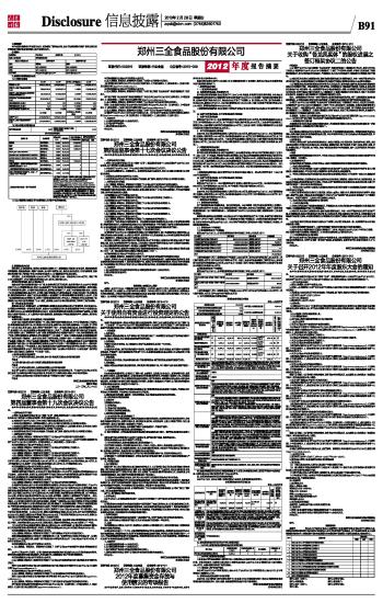证券代码:002216 证券简称:三全食品 公告编号:2013-009 郑州三全食品股份有限公司2012年度报告摘要及公告(系列) 2013-02-28 来源:证券时报网 作者: