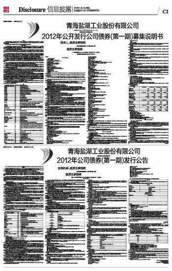 16、本公告仅对本期债券发行的有关事宜进行说明,不构成针对本期债券的任何投资建议。投资者欲详细了解本期债券发行情况,请仔细阅读《青海盐湖工业股份有限公司2012年公开发行公司债券(第一期)募集说明书》,该募集说明书摘要已刊登在2013年3月4日的《证券时报》上。有关本次发行的相关资料,投资者亦可到深圳证券交易所网站(http://www.szse.cn/)与巨潮资讯网(http://www.cninfo.com.cn)查询。