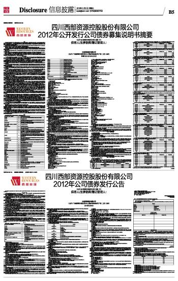 股票简称:西部资源 股票代码:600139 四川西部资源控股股份有限公司 2012年公开发行公司债券募集说明书摘要 2013-03-06 来源:证券时报网 作者:
