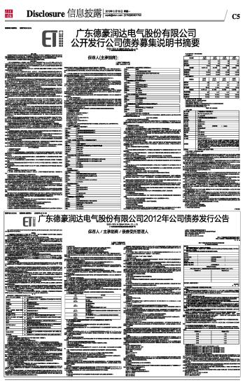 发行人声明 本募集说明书摘要的目的仅为向公众提供有关本次发行的简要情况,并不包括《广东德豪润达电气股份有限公司公开发行公司债券募集说明书》全文的各部分内容。《广东德豪润达电气股份有限公司公开发行公司债券募集说明书》全文同时刊载于深圳证券交易所网站。投资者在做出认购决定之前,应仔细阅读募集说明书全文,并以其作为投资决定的依据。 除非另有说明或要求,本募集说明书摘要所用简称和相关用语与募集说明书相同。 重大事项提示 一、发行人本期债券评级为AA;本期债券上市前,发行人最近一期末的净资产为430,402.05万元(截至2012年9月30日合并报表中所有者权益合计);发行人最近三个会计年度实现的年均可分配利润为21,754.81万元(2009年、2010年及2011年合并报表中归属于母公司所有者的净利润平均值),预计不少于本期债券利息的1.5倍。发行人在本次发行前的财务指标符合相关规定。本期债券发行及挂牌上市安排请参见发行公告。 本公司2012年年度报告的预约披露时间为2013年4月24日,本公司承诺,根据目前情况可合理预计,本公司2012年年度报告披露后仍符合公司债券的发行条件。 二、2009年末、2010年末、2011年末和2012年9月30日,合并口径下,发行人流动负债占负债总额的比重分别为99.72%、87.33%、76.63%和62.00%;母公司口径下,发行人流动负债占负债总额的比重分别为100.00%、94.16%、99.91%和100.00%,公司的债务结构不够合理,短期偿付的风险较大。本期债券发行后,募集资金主要用于偿还公司短期银行借款及补充公司流动资金,预计公司流动负债占比将有所降低,流动比率和速动比率有所提升,进而降低公司的财务风险;但发行人的负债总额和资产负债率将有所上升。 三、由于国家及各地方政府对新兴产业扶持力度的加大以及节能减排政策的持续推行,公司LED业务享有较多的政府补贴(主要为“科技三项”财政补贴资金与MOCVD设备研究开发补贴资金),对报告期内的盈利情况影响较大。2009年度、2010年度、2011年度和2012年1-9月,发行人收到的政府补助分别为810.03万元、26,956.04万元、31,026.44万元和16,368.93万元,然而归属于上市公司股东的扣除非经常性损益后的净利润分别为4,858.89万元、-130.64万元、13,221.06万元和-2,426.06万元。“科技三项”补贴政策将在2013年12月底执行完毕,且扬州市政府已于2011年7月结束对MOCVD设备的财政补贴,上述补贴政策的重大变化将在一定程度上影响未来期间LED行业的发展及公司的盈利能力。 四、发行人2009年度、2010年度、2011年度和2012年1-9月合并口径下经营活动产生的现金流量净额分别为7,689.31万元、35,809.50万元、-2,789.89万元和-23,744.16万元,母公司口径下经营活动产生的现金流量净额分别为4,048.54万元、16,171.91万元、102,150.14万元和-12,733.06万元。公司经营性现金流净额为负主要是因为LED业务大幅增长从而购置存货、支付营运费用等付现额大幅增加,同时销售收入多数以应收账款形式存在所致。如果发行人应收账款产生坏帐或者未来经营环境发生变化,公司经营活动产生的现金流将可能面临短缺与周转紧张,从而影响本期债券本息偿付的资金来源。 为保障债券持有人的合法权益,本期债券将设立专项偿债账户,提前归集本期债券本息,以保证本期债券本息的及时、足额偿付。 五、发行人截止2012年9月30日的在建工程账面余额较大,为200,998.13万元,其中LED项目工程余额为196,805.86万元;LED项目工程的90%以上将在2013年陆续转固,其余项目将于2014年6月以后转固。上述LED项目工程转固投产后将会进一步扩大LED业务的产能,从而在一定程度上保障了公司未来营业收入的增长与盈利;但同时,如果LED芯片、应用等产品的销售市场未能打开,上述在建工程可能存在不能按计划完工或者转固后的产能得不到实现,那么较大金额的前期投入或者折旧费用将对公司未来期间的盈利状况产生负面影响。 六、为扩展LED照明业务,发行人于2012年12月进行了对雷士照明控股有限公司的股权收购。本次股权收购已经公司第四届董事会第二十四次会议及2013年第一次临时股东大会审议通过,其中:通过香港联合交易所购入雷士照明260,380,000股(占其已发行普通股股份总数的8.24%),目前已完成股权变更登记,发行人董事长王冬雷已获得雷士照明的董事委任;通过股份转让协议受让NVC Inc.持有的雷士照明372,921,000股(占其已发行普通股股份总数的11.81%),目前已按照协议规定支付4.30亿港元预付款,但尚需履行中国政府相关行政部门的批准或备案程序。若上述股份转让协议得以履行,发行人将合计持有雷士照明633,301,000股(占其已发行普通股总数的20.05%),成为雷士照明的单一第一大股东,合计交易金额折算约合人民币134,334.16万元。 与此同时,为满足公司业务发展及本次股权收购资金需要,发行人已启动非公开发行股票预案,拟非公开发行股票23,000万股,其中控股股东芜湖德豪投资有限公司认购10,000万股,自然人吴长江(雷士照明创始人之一,全资持有NVC Inc.)认购13,000万股,本次非公开发行股票的价格为5.86元/股,拟募集资金总额不超过134,780.00万元,在扣除发行费用后全部用于补充流动资金。上述非公开发行事宜已经公司股东大会审议通过,尚需获得中国证券监督管理委员会的核准。 上述重大股权收购及非公开发行股票事项将对发行人近期资产负债与现金流状况及未来