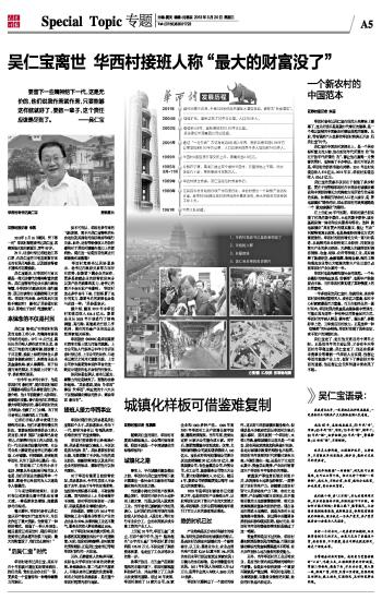 吴仁宝离世 华西村接班人称“最大的财富没了” 2013-03-20 来源:证券时报网 作者:朱凯