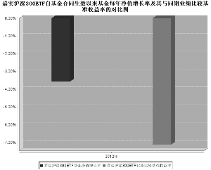 基金管理人:嘉实基金管理有限公司 基金托管人:中国银行股份有限公司 送出日期:2013年3月28日 §1 重要提示 基金管理人的董事会、董事保证本报告所载资料不存在虚假记载、误导性陈述或重大遗漏,并对其内容的真实性、准确性和完整性承担个别及连带的法律责任。本年度报告已经全部独立董事签字同意,并由董事长签发。 基金托管人中国银行股份有限公司根据本基金合同规定,于2013年3月22日复核了本报告中的财务指标、净值表现、利润分配情况、财务会计报告、投资组合报告等内容,保证复核内容不存在虚假记载、误导性陈述或者重大遗漏。 基金管理人承诺以诚实信用、勤勉尽责的原则管理和运用基金资产,但不保证基金一定盈利。 基金的过往业绩并不代表其未来表现。投资有风险,投资者在作出投资决策前应仔细阅读本基金的招募说明书及其更新。 本报告期自2012年5月7日(本基金合同生效日)起至2012年12月31日止。 本年度报告摘要摘自年度报告正文,投资者欲了解详细内容,应阅读年度报告正文。 §2 基金简介 2.1 基金基本情况 ■ 2.2 基金产品说明 ■ 2.3 基金管理人和基金托管人 ■ 2.4 信息披露方式 ■ §3 主要财务指标、基金净值表现及利润分配情况 3.1 主要会计数据和财务指标 金额单位:人民币元 ■ 注:(1)本期已实现收益指基金本期利息收入、投资收益、其他收入(不含公允价值变动收益)扣除相关费用后的余额,本期利润为本期已实现收益加上本期公允价值变动收益;(2)所述基金业绩指标不包括持有人认购或交易基金的各项费用,计入费用后实际收益水平要低于所列数字;(3)期末可供分配利润采用期末资产负债表中未分配利润与未分配利润中已实现部分的孰低数。(4)本基金合同生效日为2012年5月7日,本报告期自2012年5月7日起至2012年12月31日止。 3.2 基金净值表现 3.2.1 基金份额净值增长率及其与同期业绩比较基准收益率的比较 ■ 3.2.2 自基金合同生效以来基金份额累计净值增长率变动及其与同期业绩比较基准收益率变动的比较 ■ 图:嘉实沪深300ETF基金份额累计净值增长率与同期业绩比较基准收益率的历史走势对比图 (2012年5月7日至2012年12月31日) 注:本基金基金合同生效日2012年5月7日至报告期末未满1年。按基金合同和招募说明书的约定,本基金自基金合同生效日起3个月内为建仓期,建仓期结束时本基金的各项投资比例符合基金合同“十五(二)投资范围和(八)2、基金投资组合比例限制”的有关约定。 3.2.3 自基金合同生效以来基金每年净值增长率及其与同期业绩比较基准收益率的比较 ■ 注:本基金基金合同生效日为2012年5月7日,2012年度的相关数据根据当年实际存续期(2012年5月7日至2012年12月31日)计算。 3.3 过去三年基金的利润分配情况 本基金自基金合同生效以来未实施利润分配。 §4 管理人报告 4.1 基金管理人及基金经理情况 4.1.1 基金管理人及其管理基金的经验 本基金管理人为嘉实基金管理有限公司,成立于1999年3月25日,是经中国证监会批准设立的第一批基金管理公司之一,是中外合资基金管理公司。公司注册地在上海,总部设在北京并设深圳、成都、杭州、青岛、南京、福州、广州分公司。公司获得首批全国社保基金、企业年金投资管理人和QDII、特定资产管理业务资格。 截止2012年12月31日,基金管理人共管理2只封闭式证券投资基金、37只开放式证券投资基金,具体包括嘉实泰和封闭、嘉实丰和价值封闭、嘉实成长收益混合、嘉实增长混合、嘉实稳健混合、嘉实债券、嘉实服务增值行业混合、嘉实优质企业股票、嘉实货币、嘉实沪深300ETF联接(LOF)、嘉实超短债债券、嘉实主题混合、嘉实策略混合、嘉实海外中国股票(QDII)、嘉实研究精选股票、嘉实多元债券、嘉实量化阿尔法股票、嘉实回报混合、嘉实基本面50指数(LOF)、嘉实价值优势股票、嘉实稳固收益债券、嘉实H股指数(QDII-LOF)、嘉实主题新动力股票、嘉实多利分级债券、嘉实领先成长股票、嘉实深证基本面120ETF、嘉实深证基本面120ETF联接、嘉实黄金(QDII-FOF-LOF)、嘉实信用债券、嘉实周期优选股票、嘉实安心货币、嘉实中创400ETF、嘉实中创400ETF联接、嘉实沪深300ETF、嘉实优化红利股票、嘉实全球房地产(QDII)、嘉实理财宝7天债券、嘉实增强收益定期债券、嘉实纯债债券。其中嘉实增长混合、嘉实稳健混合、嘉实债券属于嘉实理财通系列基金,同时,管理多个全国社保基金、企业年金、特定客户资产投资组合。 4.1.2 基金经理(或基金经理小组)及基金经理助理简介 ■ 注:(1)任职日期是指本基金基金合同生效之日;(2)证券从业的含义遵从行业协会《证券业从业人员资格管理办法》的相关规定。(3)2013年1月25日,本基金管理人发布《关于嘉实沪深300ETF基金基金经理变更的公告 》,张宏民先生不再担任本基金基金经理,杨宇先生继续担任本基金基金经理职务。 4.2 管理人对报告期内本基金运作遵规守信情况的说明 报告期内,本基金管理人严格遵循了《证券法》、《证券投资基金法》及其各项配套法规、《嘉实沪深300交易型开放式指数证券投资基金基金合同》和其他相关法律法规的规定,本着诚实信用、勤勉尽责的原则管理和运用基金资产,在严格控制风险的基础上,为基金份额持有人谋求最大利益。本基金运作管理符合有关法律法规和基金合同的规定和约定,无损害基金
