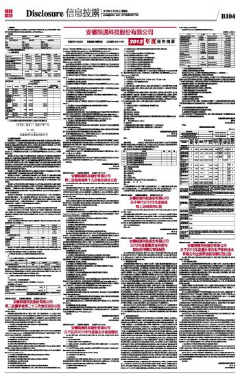 证券代码:002331 证券简称:皖通科技 公告编号:2013-019 安徽皖通科技股份有限公司2012年度报告摘要及公告(系列) 2013-03-28 来源:证券时报网 作者: