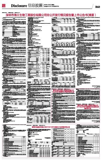 证券代码:000078 证券简称:海王生物 公告编号:2013-013 深圳市海王生物工程股份有限公司 关于非公开发行股票股东权益变动的 提示性公告 本公司及董事会全体成员保证公告内容真实、准确、完整,没有虚假记载、误导性陈述或重大遗漏。 经中国证监会核准,深圳市海王生物工程股份有限公司(以下简称"公司")于2013年3月实施了非公开发行股票。本次非公开发行了人民币普通股79,203,470股,发行价格为7.43元/股,募集资金总额为人民币588,481,782.10元,扣除发行费用后的募集资金净额为人民币569,077,578.63元。 公司已于2013年3月19日就本次增发股份向中国证券登记结算有限责任公司深圳分公司提交相关登记材料。经确认,本次增发股份将于该批股份上市日的前一交易日日终登记到账,并正式列入上市公司的股东名册。 本次非公开发行新增股份的上市日期为2013年3月29日,公司总股本由本次非公开发行前的652,510,385股增加到731,713,855股。 本次非公开发行前,公司控股股东深圳海王集团股份有限公司(以下简称"海王集团"),持有公司180,455,603股,占发行前股本总数27.66%;本次非公开发行后,海王集团持有公司股份数量未发生变化,占发行后股本总数比例为24.66%,实际控制人未发生变化。 本次非公开发行前民生加银基金管理有限公司未持有公司股票,本次非公开发行新增股份登记到账后,民生加银基金管理有限公司由于认购公司非公开发行的50,470,900股股票,导致其持有公司股份的比例从0%上升到6.90%,超过了5%。详细情况请参见公司在巨潮资讯网(www.cninfo.com.cn)上披露的《简式权益变动报告书》。 特此公告。 深圳市海王生物工程股份有限公司 董 事 局 二〇一三年三月二十七日 本版导读: