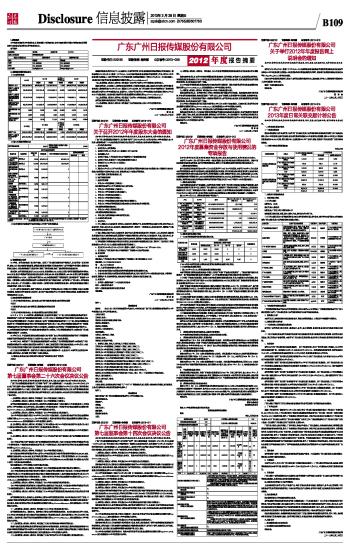 证券代码:002181 证券简称:粤传媒 公告编号:2013-012 广东广州日报传媒股份有限公司 2012年度募集资金存放与使用情况的专项报告 本公司及董事会全体成员保证信息披露的内容真实、准确、完整,没有虚假记载、误导性陈述或重大遗漏。 本公司于2006年11月20日召开的2006年第一次临时股东大会上作出向社会公开募集资金的决议。报经中国证券监督管理委员会的批准,公开发行股票募集资金。现将2012年度募集资金的存放与使用情况报告如下: 一、募集资金的募集情况 经中国证券监督管理委员会2007年10月18日证监发行字(2007)361号文批准,本公司于2007年11月5日以向本公司控股股东及本公司代办股份转让系统流通股股东定向配售、网下向询价对象询价配售与网上资金申购定价发行相结合的方式向社会公众公开发行人民币普通股7000万股,每股发行价为7.49元,共募集资金52,430万元,扣除承销费等发行所需费用计3,350万元后实际募集资金净额为49,080万元。该募集资金已于2007年11月9日止全部到位。该募集资金业经立信羊城会计师事务所有限公司验证并出具(2007)羊验字11854号《验资报告》。 二、募集资金管理情况 本公司募集资金实施专户存储制度。本公司及属下控股子公司广州大洋文化连锁店有限公司和保荐人东方花旗证券有限公司分别与中国工商银行广州大德路支行、交通银行广州海珠支行签订了募集资金三方监管协议等法律文件,并开立了募集资金专用账户。根据《中小企业板上市公司募集资金管理细则》的有关规定,本公司于2008年8月19日经2008年第三次临时股东大会决议通过《募集资金专项存储及使用管理制度》,并遵照执行。 截止2012年12月31日止,募集资金存储账户情况如下: ■ 三、募集资金的实际使用情况 (一)本公司招股说明书说明的项目投资用途: ■ (二)2012年度本公司没有发生募集资金变更情况和募集资金项目转让情况。 (三)募集资金实际使用情况 1.截止2012年12月31日止的项目投资使用募集资金情况 本公司承诺使用募集资金投资建设3个项目,分别是“印报厂扩建技术改造项目” 、“商业印刷扩建技术改造项目” 和“增加连锁经营网点技术改造项目”。2012年度募集资金使用情况对照表详见本报告附件1。 (1)印报厂扩建技术改造项目,该项目主要内容是增购印刷设备及配套,引进大型报纸自动化印刷线。项目总投资15,000万元,其中固定资产投资13,000万元,铺底流动资金2,000万元。该项目已在广东省经济贸易委员会备案,备案项目编号为06011123111000781。 印报厂扩建技术改造项目的设备和相关工程已达到预定可使用状态,从2008 年9 月开始投入生产,总产能比项目实施前提升30%以上,为本公司印报业务的发展提供了保障。该项目一直处于正常运行状态,但受市场需求的影响业务量不足,产能未得到充分利用。截止至2012年12 月31 日,印报厂扩建技术改造项目累计投入募集资金15,000.00万元。 (2)商业印刷扩建技术改造项目,该项目主要内容是增购商业印刷的设备及配套。项目总投资15,000 万元,其中固定资产投资13,000 万元,铺底流动资金2,000 万元。该项目已在广东省经济贸易委员会备案,备案项目编号为06011123111001002。该项目尚未开始投入。 近年来公司虽然保持了商业印刷业务的市场规模,但却面临商业印刷业务毛利率偏低以及现有商业印刷设备老化、产能不足等问题。针对此情况,公司将依据预计未来市场需求增长趋势以及公司的战略规划,对该项目如何实施进行重新论证。2012年度对商业印刷扩建技术改造项目未进行投入。 (3)增加连锁经营网点技术改造项目,该项目主要内容是拟在三年内在广东省珠江三角洲地区开设100 间面积约50-100 平方米的连锁经营网点,用于书刊销售、广告代理与发布。项目总投资7,500 万元。该项目已在广东省经济贸易委员会备案,备案项目编号为06010465441000979。 公司在2008年初开始投入增加连锁经营网点技术改造项目,对书报刊销售网点进行了扩张,但书报刊网点经营效果不理想。因此,本公司暂停了对该项目的投入,并结束了部分销售网点的经营。2012年度对增加连锁经营网点技术改造项目未进行投入。截止至2012年12 月31 日,增加连锁经营网点技术改造项目累计投入募集资金50.97 万元。 2. 募集资金投资项目的实施地点、实施方式变更情况 2012年度募集资金投资项目的实施地点、实施方式没有发生变更。 3. 募集资金投资项目先期投入及置换情况 根据本公司2007 年12 月25 日第六届董事会第八次会议,决议同意本公司用募集资金9,021.96万元置换预先投入募集资金投资项目-印报厂扩建技术改造项目建设的自筹资金。本次置换经立信羊城会计师事务所有限公司出具的2007 年羊专审字第12013 号《关于广东九州阳光传媒股份有限公司以自筹资金预先投入募集资金投资项目情况的专项审核报告》审核。 4. 用闲置募集资金暂时补充流动资金的情况 根据本公司2008 年1 月29 日第六届董事会第九次会议,决议通过使用不超过4,500万元的闲置募集资金补充流动资金,使用期限不超过6 个月,从2008 年2 月1 日起到2008年7 月31 日止。本公司已于2008 年7 月18 日,将该项补充流动资金全部归还募集资金专户。 根据本公司2008 年7 月28 日第六届董事会第十八次会议,决议通过将超额募集资金人民币11,580 万元用于补充本公司生产经营所需要的流动资金,