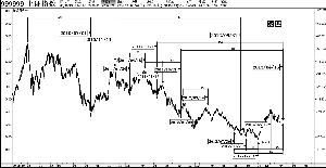 本周,作为大盘“台柱子”的权重板块--银行板块受到银监会规范银行理财产品及利率市场化预期双重利空消息打击下全线暴跌。其他的权重板块如酿酒、券商、保险等出现连续下挫走势,大盘再创调整新低,周K线收出覆盖型大阴线,形成类似“空方炮”的格局,也形成“包线”组合,中短期走势再添变数,上证指数中型级(2)浪的调整时间和空间很可能随之拓宽。 笔者近期多次指出,上证指数2月中旬开始的调整浪,很可能是“千金难买牛回头”的中型级(2)浪调整。3月初进一步指出“未来两周,上证指数震荡下行,本月中下旬在2200点附近探出一个周线级别底部……”,主要理由是根据时间周期规律分析,3月第三周、第四周分别是138周和59周时间周期对称点,大盘将形成周线级别转折可能性较大。而直至本周收盘,上证指数不但没有明显的止跌迹象,反而创出调整新低,且看起来继续深跌的可能性更大。显然,大盘很可能已经“穿越”了上述两个周线级别时间之窗,因此推断上证指数的(2)浪调整的时间和空间很可能继续拓宽。 尽管上证指数的(2)浪调整仍将持续,但笔者认为其性质依然是针对1949点至2444点升浪的调整浪、修正浪,在0.618黄金分割位2138点被有效跌破之前,暂不考虑跌破1949点的可能性。以下从上证指数中长期波浪结构进行分析: 1、长期首选数浪方式:“大牛市模式”。如图一所示,这种数浪方式居于对未来多年我国宏观经济的乐观预期,即目前处在大循环级⑤浪之循环级III浪的初级阶段,即2444点可能只是III浪(1)的顶部,目前进入III浪(2)调整。首选数浪方式估测成立概率超过60%。 2、长期次选数浪方式:图二所示的数浪方式目前仍被众多分析人士采纳和认可,是大熊市的思维,可称为“大B浪模式”。这种数浪方式认为,目前已经进入大(B)浪,目标至少是3000点,甚至略超过超过3478点。 这种数浪方式对中国经济的长期走势不乐观,因此认为大(B)浪反弹结束后,还有一波持续三五年的大(C)浪下跌,最终将跌破1664点,才能最终完成2007年开始的“超级大熊市”。这种数浪方式与“中国梦”的远景背道而驰,因此估测成立的概率不超过10%。 3、长期备选数浪方式,如果上证指数起自2444点的调整浪跌破0.618黄金分割位2138点甚至跌破2100点整数关,则应考虑一种最悲观的艾略特波浪,如图三所示。 这种数浪方式也可称为“熊途末路模式”。根据艾略特波浪理论的规则,特殊情况下,C浪以终结型楔形的形态运行,1、4浪可以重叠。这种成立的外部条件可能是出现以下一个或多个利空:国内宏观经济持续弱复苏预期落空,房地产调控下药过猛导致失控,全球金融市场再现危机,国内政策面出现实质性利空,等等。备选数浪方式估测成立概率不超过5%。 基于上述长期数浪方式的首选和次选模式的分析,笔者认为上证指数从1949点已经展开新一轮牛市,截止3月底大盘仍处在“千金难买牛回头”的调整(2)浪之中,根据时间周期分析,调整(2)浪结束的时间很可能落在4、5月份。 根据沪深股市历史走势规律,其每年(尤其是单数年份)的5月份前后,经常出现重要的转折,最近3年的4月份(或5月份)都出现了月线级别转折。因此,今年的4月份至5月份出现重要中级转折的可能性值得高度关注。结合上述的波浪分析,初步推测4、5月份可能就是(2)浪落底的时间之窗。 具体到4月份的日线级别时间之窗,如图四所示--4月15日前后汇聚了日线级别的43日、85日、360日和442日四组周期,而如图五所示,4月18日则是45日和90日两个重要江恩时间之窗汇聚点,因此推测4月中旬,大盘有望形成重要转折。 下周初大盘将对地方“国五条”细则的消息以及3月制造业采购经理指数(PMI)数据有所反应,预计反应偏乐观,出现小幅反弹(图五)。但如果上证指数的反弹受制于2300点,则(2)浪在4月中旬探出重要底部的可能性更大。牛市中的(2)浪调整末段,通常伴随着投资者普遍怀疑牛市,认为熊市还没结束,甚至伴随麻木、悲观、绝望的市场情绪,投资者届时除了可根据大盘的技术特征,也可根据这些市场情绪,来细心“聆听”牛市主升(3)浪的“脚步声”。 本版导读: