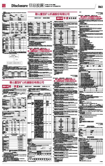 证券代码:002667 证券简称:鞍重股份 公告编号:2012—010 TitlePh 鞍山重型矿山机器股份有限公司2013第一季度报告 2013-04-16 来源:证券时报网 作者: