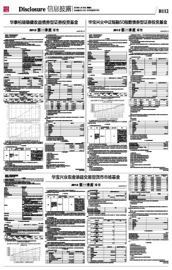 基金管理人:华宝兴业基金管理有限公司 基金托管人:中国银行股份有限公司 报告送出日期:2013年4月18日 §1 重要提示 基金管理人的董事会及董事保证本报告所载资料不存在虚假记载、误导性陈述或重大遗漏,并对其内容的真实性、准确性和完整性承担个别及连带责任。 基金托管人中国银行股份有限公司根据本基金合同规定,于2013年4月15日复核了本报告中的财务指标、净值表现和投资组合报告等内容,保证复核内容不存在虚假记载、误导性陈述或者重大遗漏。 基金管理人承诺以诚实信用、勤勉尽责的原则管理和运用基金资产,但不保证基金一定盈利。 基金的过往业绩并不代表其未来表现。投资有风险,投资者在作出投资决策前应仔细阅读本基金的招募说明书。 本报告中财务资料未经审计。 本报告期自2013年1月1日起至3月31日止。 §2 基金产品概况 ■ §3 主要财务指标和基金净值表现 3.1 主要财务指标 单位:人民币元 ■ 注:1、本期已实现收益指基金本期利息收入、投资收益、其他收入(不含公允价值变动收益)扣除相关费用后的余额,本期利润为本期已实现收益加上本期公允价值变动收益。 2、所述基金业绩指标不包括持有人认购或交易基金的各项费用,计入费用后实际收益水平要低于所列数字。 3.2 基金净值表现 3.2.1 本报告期基金份额净值增长率及其与同期业绩比较基准收益率的比较 ■ 3.2.2 自基金合同生效以来基金累计净值增长率变动及其与同期业绩比较基准收益率变动的比较 (2012年6月12日 至 2013年3月31日) ■ 注:1、本基金基金合同生效于2012年6月12日,截止报告日本基金基金合同生效未满一年。 2、按照基金合同的约定,本基金自基金合同生效之日起不超过六个月内完成建仓。截至2012年12月12日,本基金已达到合同规定的资产配置比例。 §4 管理人报告 4.1 基金经理(或基金经理小组)简介 ■ 4.2 管理人对报告期内本基金运作遵规守信情况的说明 本报告期内,本基金管理人遵守《中华人民共和国证券法》、《中华人民共和国证券投资基金法》及其各项实施细则、《华宝兴业中证短融50指数债券型证券投资基金基金合同》和其他相关法律法规的规定、监管部门的相关规定,依照诚实信用、勤勉尽责的原则管理和运用基金资产,在控制投资风险的基础上,为基金份额持有人谋取最大利益,没有损害基金份额持有人利益的行为。 由于股、债市的系统性风险和申购赎回引起的基金资产规模变化,中证短融50指数基金在短期内出现过持有的现金与到期日在一年之内的政府债券市值占基金资产净值比低于5%、持有的指数成份券及其备选成份券的投资比例低于基金资产的90%的情况。发生此类情况后,该基金均在合理期限内得到了调整,没有给投资人带来额外风险或损失。 4.3 公平交易专项说明 4.3.1 公平交易制度的执行情况 本报告期内,基金管理人通过严格执行投资决策委员会议事规则、公司股票库管理制度、中央交易室制度、防火墙机制、系统中的公平交易程序、每日交易日结报告、定期基金投资绩效评价等机制,确保所管理的所有投资组合在授权、研究分析、投资决策、交易执行、业绩评估等投资管理活动和环节得到公平对待。同时,基金管理人严格遵守法律法规关于公平交易的相关规定和公司内部制度要求,分析了本公司旗下所有投资组合之间的整体收益率差异、分投资类别(股票、债券)的收益率差异以及连续四个季度期间内、不同时间窗下同向交易的交易价差;分析结果未发现异常情况。 4.3.2 异常交易行为的专项说明 本报告期内,基金管理人未发生所有投资组合参与的交易所公开竞价同日反向交易成交较少的单边交易量超过该证券当日成交量的5%。 本报告期内,本基金未发现异常交易行为。 4.4 报告期内基金的投资策略和业绩表现说明 4.4.1 报告期内基金投资策略和运作分析 一季度宏观经济依旧在低位运行, 2月份CPI同比受短期食品因素干扰跳升至3.2%但通胀整体态势仍较平稳。1月份外汇占款创出历史新高达6800亿,在此背景下,自2月中旬开始央行公开市场操作出现方向性调整,逆回购暂停正回购则重出江湖,至3月底的连续6周回笼使得市场普遍预期央行货币政策未来将有所收紧。不过由于央行实际净回笼力度相对温和,货币市场除在春节及2月底出现阶段性紧张外,一季度内资金面整体尚可,利率债及信用债收益率均有所下行,信用债表现略优但投资者对其态度趋于谨慎。 报告期内本基金通过既定策略对标的指数进行有效跟踪,整体运行状况良好。 4.4.2 报告期内基金的业绩表现 截至本报告期末,本报告期内基金份额净值增长率为0.99%,同期业绩比较基准收益率为0.98%,基金表现领先业绩基准0.01%。 4.5 管理人对宏观经济、证券市场及行业走势的简要展望 目前来看,二季度宏观经济运行和通胀仍将较为平稳,货币政策出现明显转向的条件尚不成熟。债券市场在缺乏催化剂的情况下,难以出现趋势性行情,仍将以获取持有收益为主。由于经济仍运行在底部区间,企业景气度偏弱,对于信用债投资,要继续做好风险预防和控制,密切跟踪各行业和主体的经营状况,有所取舍,避免偶发的个体信用事件对于资产组合产生明显影响。 下一阶段,本基金将继续按照基金合同的要求,通过既定的指数化投资策略,在做好成份券调整和日常申赎的同时,严格控制跟踪