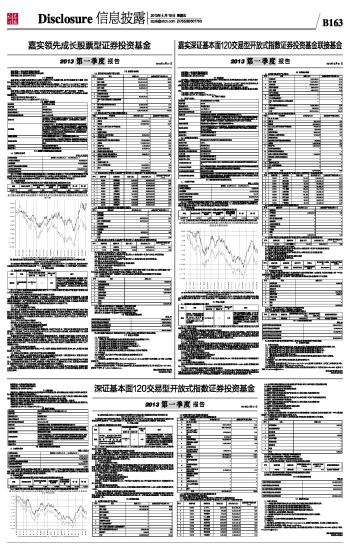 基金管理人:嘉实基金管理有限公司 基金托管人:中国银行股份有限公司 报告送出日期:2013年4月19日 §1 重要提示 基金管理人的董事会及董事保证本报告所载资料不存在虚假记载、误导性陈述或重大遗漏,并对其内容的真实性、准确性和完整性承担个别及连带责任。 基金托管人中国银行股份有限公司根据本基金合同规定,于2013年4月15日复核了本报告中的财务指标、净值表现和投资组合报告等内容,保证复核内容不存在虚假记载、误导性陈述或者重大遗漏。 基金管理人承诺以诚实信用、勤勉尽责的原则管理和运用基金资产,但不保证基金一定盈利。 基金的过往业绩并不代表其未来表现。投资有风险,投资者在作出投资决策前应仔细阅读本基金的招募说明书。 本报告期中的财务资料未经审计。 本报告期自2013年1月1日起至2013年3月31日止。 §2 基金产品概况 ■ §3 主要财务指标和基金净值表现 3.1 主要财务指标 单位:人民币元 ■ 注:(1)本期已实现收益指基金本期利息收入、投资收益、其他收入(不含公允价值变动收益)扣除相关费用后的余额,本期利润为本期已实现收益加上本期公允价值变动收益。(2)上述基金业绩指标不包括持有人认购或交易基金的各项费用,计入费用后实际收益水平要低于所列数字。 3.2 基金净值表现 3.2.1 本报告期基金份额净值增长率及其与同期业绩比较基准收益率的比较 ■ 3.2.2 自基金合同生效以来基金累计净值增长率变动及其与同期业绩比较基准收益率变动的比较 ■ 图:嘉实深证基本面120ETF基金份额累计净值增长率与同期业绩比较基准收益率的历史走势对比图 (2011年8月1日至2013年3月31日) 注:按基金合同和招募说明书的约定,本基金自基金合同生效日起3个月内为建仓期,建仓期结束时本基金的各项投资比例符合基金合同“十五、基金的投资(二)投资范围和(八)2、基金投资组合比例限制”的有关约定。 §4 管理人报告 4.1 基金经理(或基金经理小组)简介 ■ 注:(1)任职日期是指本基金基金合同生效之日;(2)证券从业的含义遵从行业协会《证券业从业人员资格管理办法》的相关规定。 4.2 管理人对报告期内本基金运作遵规守信情况的说明 报告期内,本基金管理人严格遵循了《证券法》、《证券投资基金法》及其各项配套法规、《深证基本面120交易型开放式指数证券投资基金基金合同》和其他相关法律法规的规定,本着诚实信用、勤勉尽责的原则管理和运用基金资产,在严格控制风险的基础上,为基金份额持有人谋求最大利益。本基金运作管理符合有关法律法规和基金合同的规定和约定,无损害基金份额持有人利益的行为。 4.3 公平交易专项说明 4.3.1 公平交易制度的执行情况 报告期内,基金管理人严格执行证监会《证券投资基金管理公司公平交易制度指导意见》和公司内部公平交易制度,各投资组合按投资管理制度和流程独立决策,并在获得投资信息、投资建议和实施投资决策方面享有公平的机会;通过完善交易范围内各类交易的公平交易执行细则、严格的流程控制、持续的技术改进,确保公平交易原则的实现;通过IT系统和人工监控等方式进行日常监控,公平对待旗下管理的所有投资组合。 4.3.2 异常交易行为的专项说明 报告期内,本基金未发生异常交易行为。 4.4 报告期内基金的投资策略和业绩表现说明 4.4.1 报告期内基金投资策略和运作分析 报告期内,本基金日均跟踪误差为0.01%,年度化拟合偏离度为0.22%,符合基金合同约定的日均跟踪误差不超过0.2%的限制。 4.4.2 报告期内基金的业绩表现 截至本报告期末本基金份额净值为0.7954元;本报告期基金份额净值增长率为-2.45%,业绩比较基准收益率为-2.28%。 4.5 管理人对宏观经济、证券市场及行业走势的简要展望 作为被动管理的指数基金,本基金在严守基金合同及相关法律法规要求的前提下,将继续秉承指数化投资管理策略,积极应对基金申购赎回等因素对指数跟踪效果带来的冲击,进一步降低基金的跟踪误差,力争投资回报与业绩基准保持一致。 §5 投资组合报告 5.1 报告期末基金资产组合情况 ■ 5.2 报告期末按行业分类的股票投资组合 5.2.1 报告期末指数投资按行业分类的股票投资组合 ■ 5.2.2 报告期末积极投资按行业分类的股票投资组合 报告期末,本基金未持有积极投资股票。 5.3 报告期末按公允价值占基金资产净值比例大小排序的前十名股票投资明细 5.3.1 报告期末指数投资按公允价值占基金资产净值比例大小排序的前十名股票投资明细 ■ 5.3.2 报告期末积极投资按公允价值占基金资产净值比例大小排序的前五名股票投资明细 报告期末,本基金未持有积极投资股票。 5.4 报告期末按债券品种分类的债券投资组合 报告期末,本基金未持有债券。 5.5 报告期末按公允价值占基金资产净值比例大小排名的前五名债券投资明细 报告期末,本基金未持有债券。 5.6 报告期末按公允价值占基金资产净值比例大小排名的前十名资产支持证券投资明细 报告期末,本基金未持有资产支持证券。 5.7 报告期末按公允价值占基金资产净值比例大小排名的前五名权证投资明细 报告期末,本基金未持有权证。 5.8 报告期末本基金投资的股指期货交易情况说明 报告期内,本基金未参与股指期货交易。 5.9 投资组合报告附注 5.9.1 报告期内本基金投资的前十名证券的发行主体未被监管部门立案调查