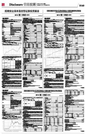 基金管理人:招商基金管理有限公司 基金托管人:招商银行股份有限公司 报告送出日期:2013年4月20日 §1 重要提示 基金管理人的董事会及董事保证本报告所载资料不存在虚假记载、误导性陈述或重大遗漏,并对其内容的真实性、准确性和完整性承担个别及连带责任。 基金托管人招商银行股份有限公司根据本基金合同规定,于2013年4月18日复核了本报告中的财务指标、净值表现和投资组合报告等内容,保证复核内容不存在虚假记载、误导性陈述或者重大遗漏。 基金管理人承诺以诚实信用、勤勉尽责的原则管理和运用基金资产,但不保证基金一定盈利。 基金的过往业绩并不代表其未来表现。投资有风险,投资者在作出投资决策前应仔细阅读本基金的招募说明书。 本报告中财务资料未经审计。 本报告期自2013年1月1日起至3月31日止。 §2 基金产品概况 ■ §3 主要财务指标和基金净值表现 3.1 主要财务指标 单位:人民币元 ■ 注:1、上述基金业绩指标不包括持有人认购或交易基金的各项费用,计入费用后实际收益水平要低于所列数字; 2、本期已实现收益指基金本期利息收入、投资收益、其他收入(不含公允价值变动收益)扣除相关费用后的余额,本期利润为本期已实现收益加上本期公允价值变动收益。 3.2 基金净值表现 3.2.1 本报告期基金份额净值增长率及其与同期业绩比较基准收益率的比较 招商安泰债券A ■ 招商安泰债券B ■ 注:业绩比较基准收益率=95%×中信标普国债指数+5%×同业存款利率,业绩比较基准在每个交易日实现再平衡。 3.2.2 自基金合同生效以来基金累计净值增长率变动及其与同期业绩比较基准收益率变动的比较 ■ ■ 注:1、招商安泰债券的债券投资比例范围为不低于85%,现金或到期日在一年以内的政府债券大于等于5%。根据本系列基金合同规定,本基金设立后,投资建仓期为三个月,特殊情况下不超过六个月。本基金于2003年4月28日成立,建仓期结束时相关比例均符合上述规定的要求; 2、招商安泰债券从2006年4月12日起费率结构进行调整,在原申购赎回费收费方式基础上新增销售服务费收费方式:保留原申购、赎回费收费方式,选择缴纳申购赎回费而不缴纳销售服务费的基金份额为A类基金份额。2006年4月11日登记在册的本基金基金份额自动归为A类基金份额;增加销售服务费收费方式,选择缴纳销售服务费而不缴纳申购赎回费的基金份额为B类基金份额。 §4 管理人报告 4.1 基金经理(或基金经理小组)简介 ■ 注:1、本基金首任基金经理的任职日期为本基金合同生效日期;后任基金经理的任职日期以及历任基金经理的离任日期为公司相关会议做出决定的公告(生效)日期; 2、证券从业年限计算标准遵从行业协会《证券业从业人员资格管理办法》中关于证券从业人员范围的相关规定。 4.2 管理人对报告期内本基金运作遵规守信情况的说明 基金管理人声明:在本报告期内,本基金管理人严格遵守《中华人民共和国证券投资基金法》、《证券投资基金运作管理办法》等有关法律法规及其各项实施准则的规定以及《招商安泰系列开放式证券投资基金基金合同》等基金法律文件的约定,本着诚实信用、勤勉尽责的原则管理和运用基金资产,在严格控制风险的前提下,为基金持有人谋求最大利益。本报告期内,基金运作整体合法合规,无损害基金持有人利益的行为。基金的投资范围以及投资运作符合有关法律法规及基金合同的规定。 4.3 公平交易专项说明 4.3.1 公平交易制度的执行情况 基金管理人(以下简称“公司”)已建立较完善的研究方法和投资决策流程,确保各投资组合享有公平的投资决策机会。公司建立了所有组合适用的投资对象备选库,制定明确的备选库建立、维护程序。公司拥有健全的投资授权制度,明确投资决策委员会、投资总监、投资组合经理等各投资决策主体的职责和权限划分,投资组合经理在授权范围内可以自主决策,超过投资权限的操作需要经过严格的审批程序。公司的相关研究成果向内部所有投资组合开放,在投资研究层面不存在各投资组合间不公平的问题。公司交易部在报告期内,对所有组合的各条指令,均在中央交易员的统一分派下,本着持有人利益最大化的原则执行了公平交易。 4.3.2 异常交易行为的专项说明 公司严格控制不同投资组合之间的同日反向交易,严格禁止可能导致不公平交易和利益输送的同日反向交易。确因投资组合的投资策略或流动性等需要而发生的同日反向交易,公司要求相关投资组合经理提供决策依据,并留存记录备查,完全按照有关指数的构成比例进行投资的组合等除外。 本报告期内,本基金各项交易均严格按照相关法律法规、基金合同的有关要求执行,本公司所有投资组合参与的交易所公开竞价同日反向交易不存在成交较少的单边交易量超过该证券当日成交量的5% 的情形。报告期内未发现有可能导致不公平交易和利益输送的重大异常交易行为。 4.4 报告期内基金的投资策略和业绩表现说明 4.4.1 报告期内基金投资策略和运作分析 (1)宏观经济分析: 2013年1季度,经济增长比较平淡,需求方面基本稳定,生产有所回落,市场预期的旺季回暖在3月份并未发生,普遍调低了对经济复苏力度的预期。特别是房地产方面的“国五条”调控,以及银监会对理财投资非标债权的监管,更是打击了市场信心,悲观者甚至认为