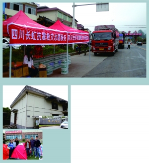 图片说明: 四川长虹在成雅高速雅安北出口提供志愿服务 上图为雅化集团305卷子筒工房因地震造成墙壁裂痕 左图为雅安部分券商营业部员工与证券时报记者在一起 (翟超/制图)