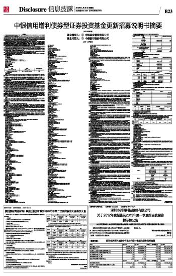 中银信用增利债券型证券投资基金更新招募说明书摘要(2013年第1号) 2013-04-26 来源:证券时报网 作者:
