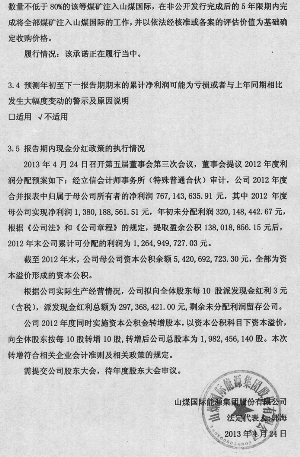 §1 重要提示 1.1 本公司董事会、监事会及其董事、监事、高级管理人员保证本报告所载资料不存在任何虚假记载、误导性陈述或者重大遗漏,并对其内容的真实性、准确性和完整性承担个别及连带责任。 1.2 如有董事未出席董事会,应当单独列示其姓名 ■ 1.3 公司第一季度财务报告未经审计。 1.4 ■ 公司负责人郭海、主管会计工作负责人王瑞增及会计机构负责人(会计主管人员)郝小平声明:保证本季度报告中财务报告的真实、完整。 §2 公司基本情况 2.1 主要会计数据及财务指标 币种:人民币 ■ 扣除非经常性损益项目和金额: 单位:元 币种:人民币 ■ 2.2 报告期末股东总人数及前十名无限售条件股东持股情况表 单位:股 ■ §3 重要事项 3.1 公司主要会计报表项目、财务指标大幅度变动的情况及原因 √适用 □不适用 1.销售费用较上年度期末减少33.65%,系报告期内港杂费用比上年同期减少所致; 2.投资收益较上年度期末减少76.89%,系报告期内收到的投资单位分红比上年同期减少所致; 3.营业外收入较上年度期末减少64.91%,系报告期内子公司收到的违约金减少所致; 4.利润总额较上年度期末减少30.32%,系报告期内煤炭价格下跌,航运亏损所致; 5.所得税费用较上年度期末减少49.51%,系报告期内利润下降,使所得税费用下降所致; 6.少数股东损益较上年度期末减少31.69%,系报告期内利润比上年同期下降,使少数股东损益下降所致; 7.收到其他与经营活动有关的现金较上年度期末减少36.88%,系报告期内集团往来款比上年同期减少所致; 8.支付其他与经营活动有关的现金较上年度期末减少43.53%,系报告期内支付集团内部往来款比上年同期减少所致; 9.取得投资收益收到的现金较上年度期末减少88.64%,系报告期内收到的投资单位分红比上年同期减少所致; 10.收到其他与投资活动有关的现金较上年度期末增加765,202.17%,系报告期内合并基建矿工程煤收入增加所致; 11.购建固定资产、无形资产和其他长期资产支付的现金较上年度期末增加73.14%,系报告期内合并基建矿增加固定资产所致; 12.支付其他与投资活动有关的现金较上年度期末增加313.63%,系报告期内基建矿支付的与工程煤相关支出所致; 13.偿还债务支付的现金较上年度期末增加50.02%,系报告期内偿还银行借款比上年同期增加所致; 14.支付其他与筹资活动有关的现金较上年度期末减少100.00%,系报告期内无支付的款项所致; 15.应付票据较上年度期末增加38.01%,系报告期内采购结算应付票据比上年增加所致; 16.应付利息较上年度期末增加34.30%,系报告期内应付利息尚未支付所致。 3.2 重大事项进展情况及其影响和解决方案的分析说明 □适用 √不适用 3.3 公司、股东及实际控制人承诺事项履行情况 √适用 □不适用 山煤集团在公司重大资产重组过程中所做的承诺及其履行情况如下: 1、关于保证公司独立性的承诺 承诺要点:保证公司人员独立、资产独立完整、财务独立、机构独立、业务独立。 履行情况:报告期内,控股股东行为规范,没有超越股东大会直接干预公司的决策和经营活动,公司与控股股东在人员、资产、财务、机构和业务方面完全独立。 2、关于公司重组所负债务偿还的承诺 承诺要点:公司因重组形成的对山煤集团 44,655.90 万元负债,公司可在重组完成后5 年内偿还,重组完成后2 年内可仅向山煤集团偿还当年度发生之利息,第3 年至第5 年可每年归还14,885.30 万元本金及当年度发生之利息。在未偿还期间,对于上述负债山煤集团将按照资产交割日中国人民银行颁布的一年期银行贷款基准利率下浮10%的标准向公司收取利息。 履行情况:该承诺正在履行中,公司已根据上述承诺的利率水平自2011 年1 月1 日起对该笔负债按月计提利息。 3、关于5 家煤炭贸易及服务公司股权托管事项的承诺 承诺要点:大同口泉、临汾临北、吕梁晋煜、高平康瀛、大同晶海达等5 家公司由于相关土地、房产的权属存在瑕疵,因此,在重大资产重组中未注入山煤国际。山煤集团通过签署《股权托管协议》,将上述5 家公司托管给山煤国际下属全资子公司经营,托管期限为2009 年1 月1 日至2010 年12 月31 日。 履行情况:由于前述托管期满后,高平康瀛的股权收购事项已完成,大同口泉等4?家公司的土地、房产瑕疵问题仍未得到有效解决,山煤集团与山煤国际续签了《股权托管协议》,再次将上述4家公司托管给山煤国际,托管期限为2011年1月1日至2012?年12?月31?日,托管费用为每公司10?万元/年,合计为40?万元/年。 4、关于避免同业竞争的补充承诺 承诺要点:①自重组完成后两年内完善5 家托管公司瑕疵土地、资产的权属,并由上市公司根据其业务经营发展需要收购上述五家公司资产或股权;②在宁武洗煤厂建成投产、开展正常经营活动后,由上市公司根据业务经营发展需要收购其股权,如自本次重组完成后三年内,宁武洗煤厂仍无法正常开展经营活动,或虽正常经营但未能产生稳定的利润、难以满足注入上市公司的条件,山煤集团将采取关闭宁武洗煤厂或将其转让给独立第三方等措施,不再继续经营宁武洗煤厂;③在取得兼并重组煤矿的所有权、所购煤矿完成必要的改扩建建设、取得全部经营资质和资格、具备生产能力、建立了稳定的盈利模式、能够产生稳定利润或上市公司认为适当的时候,由上市公司根据其业务经营发展需要选择采取收购、委托经营或其他