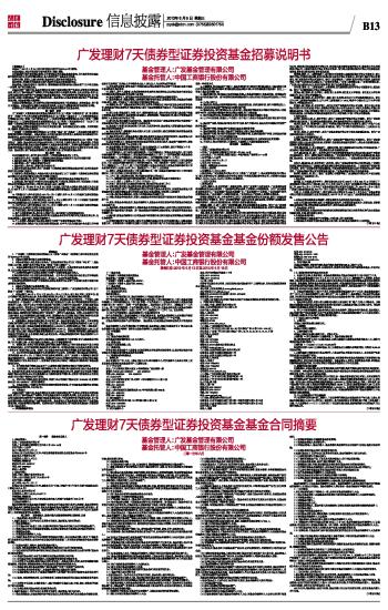 基金管理人:广发基金管理有限公司 基金托管人:中国工商银行股份有限公司 【重要提示】 本基金于2013年1月25日经中国证监会证监许可[2013]63号文核准。 本基金管理人保证招募说明书的内容真实、准确、完整。 本招募说明书经中国证监会核准,但中国证监会对本基金募集的核准,并不表明其对本基金的价值和收益作出实质性判断或保证,也不表明投资于本基金没有风险。 投资有风险,投资人认购(或申购)基金时应认真阅读本招募说明书。 基金管理人管理的其他基金的业绩不构成对本基金业绩表现的保证。 基金管理人依照恪尽职守、诚实信用、谨慎勤勉的原则管理和运用基金财产,但不保证基金一定盈利,也不保证最低收益。 本基金投资于证券市场,基金净值会因为证券市场波动等因素产生波动,投资者在投资本基金前,需充分了解本基金的产品特性,并承担基金投资中出现的各类风险,包括:因政治、经济、社会等环境因素对证券价格产生影响而形成的系统性风险,个别证券特有的非系统性风险,由于基金投资人连续大量赎回基金产生的流动性风险,基金管理人在基金管理实施过程中产生的基金管理风险,本基金的特定风险等等。 本基金为债券型基金,其长期平均风险和预期收益率低于股票型基金、混合型基金,高于货币市场基金。本基金需承担债券市场的系统性风险,以及因个别债券违约所形成的信用风险。 投资者在进行投资决策前,请仔细阅读本基金的招募说明书及基金合同。 第一部分 绪言 《广发理财7天债券型证券投资基金招募说明书》(以下简称“招募说明书”或“本招募说明书”)依照《中华人民共和国证券投资基金法》(以下简称“《基金法》”)、《证券投资基金运作管理办法》(以下简称“《运作管理办法》”)、《证券投资基金销售管理办法》(以下简称“《销售管理办法》”)、《证券投资基金信息披露管理办法》(以下简称“《信息披露办法》”)以及《广发理财7天债券型证券投资基金基金合同》(以下简称“基金合同”)编写。 基金管理人承诺本招募说明书不存在任何虚假记载、误导性陈述或重大遗漏,并对其真实性、准确性、完整性承担法律责任。 广发理财7天债券型证券投资基金(以下简称“基金”或“本基金”)是根据本招募说明书所载明的资料申请募集的。本基金管理人没有委托或授权任何其他人提供未在本招募说明书中载明的信息,或对本招募说明书作任何解释或者说明。 本招募说明书根据本基金的基金合同编写,并经中国证券监督管理委员会(以下简称“中国证监会”)核准。基金合同是约定基金合同当事人之间权利、义务的法律文件。基金投资人自依基金合同取得基金份额,即成为基金份额持有人和基金合同的当事人,其持有基金份额的行为本身即表明其对基金合同的承认和接受,并按照《基金法》、基金合同及其他有关规定享有权利、承担义务。基金投资人欲了解基金份额持有人的权利和义务,应详细查阅基金合同。 第二部分 释义 在本招募说明书中,除非文意另有所指,下列词语或简称具有以下含义: 1、招募说明书:指《广发理财7天债券型证券投资基金招募说明书》及其定期的更新 2、基金或本基金:指广发理财7天债券型证券投资基金 3、基金管理人:指广发基金管理有限公司 4、基金托管人:指中国工商银行股份有限公司 5、基金合同或本基金合同:指《广发理财7天债券型证券投资基金基金合同》及对本基金合同的任何有效修订和补充 6、托管协议:指基金管理人与基金托管人就本基金签订之《广发理财7天债券型证券投资基金托管协议》及对该托管协议的任何有效修订和补充 7、基金份额发售公告:指《广发理财7天债券型证券投资基金基金份额发售公告》 8、法律法规:指中国现行有效并公布实施的法律、行政法规、规范性文件、司法解释、行政规章以及其他对基金合同当事人有约束力的决定、决议、通知等 9、《基金法》:指2003年10月28日经第十届全国人民代表大会常务委员会第五次会议通过,自2004年6月1日起实施的《中华人民共和国证券投资基金法》及颁布机关对其不时做出的修订 10、《销售办法》:指中国证监会2011年6月9日颁布、同年10月1日实施的《证券投资基金销售管理办法》及颁布机关对其不时做出的修订 11、《信息披露办法》:指中国证监会2004年6月8日颁布、同年7月1日实施的《证券投资基金信息披露管理办法》及颁布机关对其不时做出的修订 12、《运作办法》:指中国证监会2004年6月29日颁布、同年7月1日实施的《证券投资基金运作管理办法》及颁布机关对其不时做出的修订 13、中国证监会:指中国证券监督管理委员会 14、银行业监督管理机构:指中国人民银行和/或中国银行业监督管理委员会 15、基金合同当事人:指受基金合同约束,根据基金合同享有权利并承担义务的法律主体,包括基金管理人、基金托管人和基金份额持有人 16、个人投资者:指依据有关法律法规规定可投资于证券投资基金的自然人 17、机构投资者:指依法可以投资证券投资基金的、在中华人民共和国境内合法登记并存续或经有关政府部门批准设立并存续的企业法人、事业法人、社会团体或其他组织 18、合格境外投资者:指符合现行有效的相关法律法规规定可以投资于中国境内证券市场的中国境外的机构投资者 19