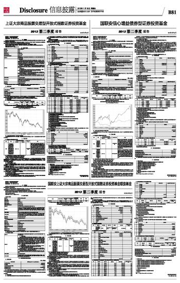 基金管理人:国联安基金管理有限公司 基金托管人:中国银行股份有限公司 报告送出日期: 二〇一三年七月十八日 §1 重要提示 基金管理人的董事会及董事保证本报告所载资料不存在虚假记载、误导性陈述或重大遗漏,并对其内容的真实性、准确性和完整性承担个别及连带责任。 基金托管人中国银行股份有限公司根据本基金合同规定,于2013年7月16日复核了本报告中的财务指标、净值表现和投资组合报告等内容,保证复核内容不存在虚假记载、误导性陈述或者重大遗漏。 基金管理人承诺以诚实信用、勤勉尽责的原则管理和运用基金资产,但不保证基金一定盈利。 基金的过往业绩并不代表其未来表现。投资有风险,投资者在作出投资决策前应仔细阅读本基金的招募说明书。 本报告中财务资料未经审计。 本报告期自2013年4月1日起至6月30日止。 §2 基金产品概况 2.1基金产品概况 ■ 2.1.1目标基金基本情况 ■ 注:本表所列的基金主代码510170为本基金二级市场交易代码,本基金一级市场申购赎回代码为510171。 2.1.2目标基金产品概况 ■ §3 主要财务指标和基金净值表现 3.1 主要财务指标 单位:人民币元 ■ 注:1、本期已实现收益指基金本期利息收入、投资收益、其他收入(不含公允价值变动收益)扣除相关费用后的余额,本期利润为本期已实现收益加上本期公允价值变动收益,包含停牌股票按公允价值调整的影响。 2、上述基金业绩指标不包括持有人交易基金的各项费用,例如,开放式基金的申购赎回费等,计入费用后实际收益要低于所列数字。 3.2 基金净值表现 3.2.1 本报告期基金份额净值增长率及其与同期业绩比较基准收益率的比较 ■ 3.2.2自基金合同生效以来基金累计份额净值增长率变动及其与同期业绩比较基准收益率变动的比较 国联安上证大宗商品股票交易型开放式指数证券投资基金联接基金 累计份额净值增长率与同期业绩比较基准收益率的历史走势对比图 (2010年12月1日至2013年6月30日) ■ 注:1、本基金业绩比较基准为95%×上证大宗商品股票指数收益率+5%×银行活期存款利率(税后); 2、本基金基金合同于2010年12月1日生效。本基金建仓期为自基金合同生效之日起的6个月,建仓期结束时各项资产配置符合合同约定。 §4 管理人报告 4.1 基金经理(或基金经理小组)简介 ■ 注:1、基金经理的任职日期和离职日期为公司对外公告之日; 2、证券从业年限的统计标准为证券行业的工作经历年限。 4.2 管理人对报告期内本基金运作遵规守信情况的说明 本报告期内,本基金管理人严格遵守《中华人民共和国证券投资基金法》、《国联安上证大宗商品股票交易型开放式指数证券投资基金联接基金基金合同》及其他相关法律法规、法律文件的规定,本着诚实信用、勤勉尽责的原则管理和运用基金财产,在严格控制风险的前提下,为基金份额持有人谋求最大利益。本基金运作管理符合有关法律法规和基金合同的规定和约定,无损害基金份额持有人利益的行为。 4.3 公平交易专项说明 4.3.1 公平交易制度的执行情况 本基金管理人遵照相应法律法规和内部规章,制定并完善了《国联安基金管理有限公司公平交易制度》(以下简称“公平交易制度”),用以规范包括投资授权、研究分析、投资决策、交易执行以及投资管理过程中涉及的实施效果与业绩评估等投资管理活动相关的各个环节。 本报告期内,本基金管理人严格执行公平交易制度的规定,公平对待不同投资组合,确保各投资组合在获得投资信息、投资建议和投资决策等方面均享有平等机会;在交易环节严格按照时间优先,价格优先的原则执行指令;如遇指令价位相同或指令价位不同但市场条件都满足时,及时执行交易系统中的公平交易模块;采用公平交易分析系统对不同投资组合的交易价差进行定期分析;对投资流程独立稽核等。 本报告期内,公司旗下所有投资组合参与的交易所公开竞价同日反向交易成交较少的单边交易量未发现有超过该证券当日成交量5%的情况。公平交易制度总体执行情况良好。 4.3.2 异常交易行为的专项说明 本报告期内未发现存在可能导致不公平交易和利益输送的无法解释的异常交易行为。 4.4 报告期内基金的投资策略和运作分析 2013年第二季度,国内宏观经济没有出现明显改善的趋势,而流动性方面却在逐步收紧,在对美国量化宽松政策逐渐退出的宏观环境之下,国际市场的大宗商品价格表现不佳,国内市场的大宗商品股票也持续下跌。 从上证商品指数的各个板块表现来看,第二季度石油石化等行业表现相对较好,煤炭、黄金等行业表现相对较差。本报告期内,本基金根据基金合同的约定,保持在相当比例的净资产投资于商品ETF中,以跟踪上证商品指数,将跟踪误差控制在合理范围。 4.5 报告期内基金的业绩表现 截止报告期末,本基金份额净值为0.487元,本报告期份额净值增长率为-23.67%,同期业绩比较基准收益率为-24.49%。本报告期内,日均跟踪偏离度为0.07%,年化跟踪误差为1.35%,分别符合基金合同约定的日均跟踪偏离度绝对值不超过0.35%,以及年化跟踪误差不超过4.0%的限制。 §5 投资组合报告 5.1 报告期末基金资产组合情况 ■ 5.2 期末投资目标基金明细 ■ 5.3 报告期末按行业分类的股票投资组合 ■ 5.4 报告期末按公允价值占基金资产净值比例大小排序的前十名股票投资明细 ■ 5.5 报告期末按债券
