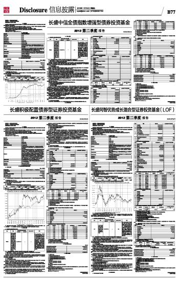 基金管理人:长盛基金管理有限公司 基金托管人:中国农业银行股份有限公司 报告送出日期:2013年7月18日 §1 重要提示 基金管理人的董事会及董事保证本报告所载资料不存在虚假记载、误导性陈述或重大遗漏,并对其内容的真实性、准确性和完整性承担个别及连带责任。 基金托管人中国农业银行股份有限公司根据本基金合同规定,于2013年7月17日复核了本报告中的财务指标、净值表现和投资组合报告等内容,保证复核内容不存在虚假记载、误导性陈述或者重大遗漏。 基金管理人承诺以诚实信用、勤勉尽责的原则管理和运用基金资产,但不保证基金一定盈利。 基金的过往业绩并不代表其未来表现。投资有风险,投资者在做出投资决策前应仔细阅读本基金的招募说明书。 本报告中的财务资料未经审计。 本报告期自2013年4月1日起至2013年6月30日止。 §2 基金产品概况 ■ §3 主要财务指标和基金净值表现 3.1 主要财务指标 单位:人民币元 ■ 注:1、所述基金业绩指标不包括基金份额持有人认购或交易基金的各项费用,计入费用后实际收益水平要低于所列数字。 2、所列数据截止到2013年6月30日。 3、本期已实现收益指基金本期利息收入、投资收益、其他收入(不含公允价值变动收益)扣除相关费用后的余额,本期利润为本期已实现收益加上本期公允价值变动收益。 3.2 基金净值表现 3.2.1 本报告期基金份额净值增长率及其与同期业绩比较基准收益率的比较 ■ 3.2.2 自基金合同生效以来基金累计净值增长率变动及其与同期业绩比较基准收益率变动的比较 ■ §4 管理人报告 4.1 基金经理(或基金经理小组)简介 ■ 注:1、上表基金经理的任职日期和离任日期均指公司决定确定的聘任日期和解聘日期; 2、“证券从业年限”中“证券从业”的含义遵从行业协会《证券业从业人员资格管理办法》的相关规定等。 4.2 管理人对报告期内本基金运作遵规守信情况的说明 本报告期内,本基金管理人严格按照《证券投资基金法》及其各项实施准则、《长盛中信全债指数增强型债券投资基金基金合同》和其他有关法律法规、监管部门的相关规定,依照诚实信用、勤勉尽责的原则管理和运用基金资产,在严格控制投资风险的基础上,为基金份额持有人谋求最大利益,没有损害基金份额持有人利益的行为。 4.3 公平交易专项说明 4.3.1 公平交易制度的执行情况 报告期内,公司严格执行《公司公平交易细则》各项规定,在研究、投资授权与决策、交易执行等各个环节,公平对待旗下所有投资组合,包括公募基金、社保组合、特定客户资产管理组合等。具体如下: 研究支持,公司旗下所有投资组合共享公司研究部门研究成果,所有投资组合经理在公司研究平台上拥有同等权限。 投资授权与决策,公司实行投资决策委员会领导下的投资组合经理负责制,各投资组合经理在投资决策委员会的授权范围内,独立完成投资组合的管理工作。各投资组合经理遵守投资信息隔离墙制度。 交易执行,公司实行集中交易制度,所有投资组合的投资指令均由交易部统一执行委托交易。交易部依照《公司公平交易细则》的规定,场内交易,强制开启恒生交易系统公平交易程序;场外交易,严格遵守相关工作流程,保证交易执行的公平性。 投资管理行为的监控与分析评估,公司风险管理部、监察稽核部,依照《公司公平交易细则》的规定,持续、动态监督公司投资管理全过程,并进行分析评估,及时向公司管理层报告发现问题,保障公司旗下所有投资组合均被公平对待。 公司对过去4个季度的同向交易行为进行数量分析,计算溢价率、贡献率、占优比等指标,使用双边90%置信水平对1日、3日、5日的交易片段进行T检验,未发现违反公平交易及利益输送的行为。 4.3.2 异常交易行为的专项说明 本报告期内,本公司旗下所有投资组合参与的交易所公开竞价交易中,未发现同日反向交易成交较少的单边交易量超过该证券当日成交量的5%的交易。 本报告期内,未发现本基金有可能导致不公平交易和利益输送的异常交易行为。 4.4 报告期内基金的投资策略和业绩表现说明 4.4.1 报告期内基金投资策略和运作分析 (一)报告期内行情回顾 2013年第二季度,在通胀水平继续回落、经济弱复苏态势进一步明确及货币市场资金大部分时间相对宽松的基本面环境下,债券市场在4-5月走出一波牛市行情。具体来看:利率债方面,长端收益率处于窄幅震荡的走势,短端收益率曲线呈现波动向上的走势,期限利差曲线不断收窄,收益率曲线呈现扁平化趋势;信用债方面,短端收益率上行幅度大于长端收益率,收益率曲线逐渐扁平化,高低评级债券收益率均呈现窄幅震荡的态势,信用利差基本保持不变。进入6月中下旬,银行间市场流动性意外收紧,部分金融机构为补充流动性压缩杠杆,引发债市调整,短端收益率大幅上升,出现利率倒挂的现象。 货币市场方面,二季度银行间货币市场利率维持在较低水平,银行间资金面总体保持充裕,以银行间七天回购利率为例,除6月中下旬外,该利率在一季度基本维持在3.5%左右。除6个月品种外,各中短期限Shibor利率维持在较低水平。6月中下旬银行间市场流动性意外收紧,货币市场利率飞涨,Shibor隔夜利率曾高达13.44%,银行间资金面相当紧张。 纯债资产以外,受经济基本面弱复苏及影子银行清理政策影响,二季度A股呈现震荡下行的态势
