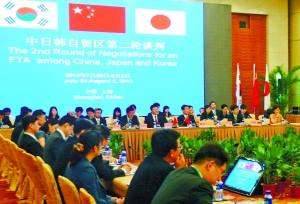 中日韩自贸区第二轮谈判7月30日起至8月2日在上海举行,中国商务部国际贸易谈判副代表俞建华、日本外务省副部级审议官长岭安正、韩国产业通商资源部通商交涉室室长禹泰熙率中日韩代表团参加谈判。本轮谈判就货物贸易、服务贸易、原产地规则、海关程序和便利化、贸易救济、TBT/SPS、竞争政策、知识产权、电子商务等议题举行磋商和交流。 (中新社/供图) 本版导读: