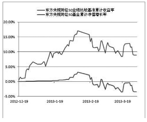(二)自基金合同生效以来基金累计净值收益率与业绩比较基准收益率的历史走势对比图 ■ 注:①根据《东方央视财经50指数增强型证券投资基金基金合同》的规定,本基金的投资组合比例为:投资于股票的资产占基金资产的比例为90%-95%,其中央视财经50指数的成份股及其备选成份股的投资比例不低于股票资产的80%,货币市场工具、债券及法律法规或中国证监会允许基金投资的其他金融工具占基金资产比例为5%-10%,其中现金或者到期日在一年以内的政府债券不低于基金资产净值的5%,投资的权证市值占基金资产净值的比例不超过3%。基金的投资组合应在基金合同生效之日起6个月内达到规定的标准。 ②本基金建仓期为6个月,建仓期结束时各项资产配置比例符合合同规定。本基金合同生效日为2012年12月19日,截至报告日2013年3月31日,基金合同生效未满一年。 ③所述基金业绩指标不包括持有人认购或交易基金的各项费用,计入费用后实际收益水平要低于所列数字。 十二、费用概览 (一)基金费用的种类 1、基金管理人的管理费; 2、基金托管人的托管费; 3、《基金合同》生效后与基金相关的标的指数使用许可费; 4、《基金合同》生效后与基金相关的信息披露费用; 5、《基金合同》生效后与基金相关的会计师费、律师费和诉讼费; 6、基金份额持有人大会费用; 7、基金的证券交易费用; 8、基金的银行汇划费用; 9、按照国家有关规定和《基金合同》约定,可以在基金财产中列支的其他费用。 (二)基金费用计提方法、计提标准和支付方式 1、基金管理人的管理费 本基金的管理费按前一日基金资产净值的1.0%年费率计提。管理费的计算方法如下: H=E×1.0%÷当年天数 H为每日应计提的基金管理费 E为前一日的基金资产净值 基金管理费每日计算,逐日累计至每月月末,按月支付,由基金管理人向基金托管人发送基金管理费划款指令,基金托管人复核后于次月前3个工作日内从基金财产中一次性支付给基金管理人。若遇法定节假日、公休假等,支付日期顺延。 2、基金托管人的托管费 本基金的托管费按前一日基金资产净值的0.2%的年费率计提。托管费的计算方法如下: H=E×0.2%÷当年天数 H为每日应计提的基金托管费 E为前一日的基金资产净值 基金托管费每日计算,逐日累计至每月月末,按月支付,由基金管理人向基金托管人发送基金托管费划款指令,基金托管人复核后于次月前3个工作日内从基金财产中一次性支取。若遇法定节假日、公休日等,支付日期顺延。 3、《基金合同》生效后与基金相关的标的指数使用许可费 本基金的标的指数使用许可费按前一日基金资产净值的0.05%的年费率计提。指数使用许可费费的计算方法如下: 一般计提方式为: H=E×0.05%÷当年天数 其中:H为每日应付的指数使用许可费; E为前一日的基金资产净值; 本基金合同生效之日所在季度,指数使用许可费按实际计提金额收取。自基金合同生效之日所在季度的下一季度起,指数使用许可费收取下限为每季度5万元,即不足5万元时按照5万元收取。基金管理人可根据指数许可使用协议和基金份额持有人的利益,对上述计提方式进行合理变更并公告。 基金管理人可根据指数许可使用协议和基金份额持有人的利益,对上述计提方式进行合理变更并公告。 指数使用许可费每日计算,逐日累计,按季支付。由基金管理人向基金托管人发送指数使用费划款指令,基金托管人复核后于次季初20个工作日内从基金财产中一次性支付给指数所有人。 上述“一、基金费用的种类中第4-9项费用”,根据有关法规及相应协议规定,按费用实际支出金额列入当期费用,由基金托管人从基金财产中支付。 (三)不列入基金费用的项目 下列费用不列入基金费用: 1、基金管理人和基金托管人因未履行或未完全履行义务导致的费用支出或基金财产的损失; 2、基金管理人和基金托管人处理与基金运作无关的事项发生的费用; 3、《基金合同》生效前的相关费用; 4、其他根据相关法律法规及中国证监会的有关规定不得列入基金费用的项目。 (四)基金合同生效后运作前产生的相关费用由管理人垫付,运作后由基金管理人向基金托管人发送划付指令,经基金托管人复核后于次日起3个工作日内从基金资产中一次性支付给基金管理人。 (五)基金管理费和基金托管费的调整 基金管理人和基金托管人可根据基金发展情况调整基金管理费率和基金托管费率。降低基金管理费率和基金托管费率,无须召开基金份额持有人大会。基金管理人必须依照有关规定最迟于新的费率实施日前在指定媒体和基金管理人网站上刊登公告。 (六)基金税收 本基金运作过程中涉及的各纳税主体,其纳税义务按国家税收法律、法规执行。 十三、对招募说明书更新部分的说明 东方央视财经50指数增强型证券投资基金招募说明书(更新)(2013年第1号)依据《中华人民共和国证券投资基金法》、《证券投资基金运作管理办法》、《证券投资基金销售管理方法》、《证券投资基金信息披露管理办法》及其他有关法律法规的要求,结合本基金管理人对本基金实施的投资管理活动进行了更新,主要内容如下: (一)在“重要提示”中,更新了基金合同生效时间、“招募说明书有关财务数据的截止日期”及“其他内容的截止日期”。 (二)在“三、基金管理人”部分,对基金管理人的相关内容进行