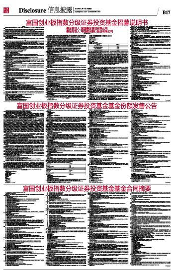 重要提示 1、富国创业板指数分级证券投资基金的募集申请已获中国证监会证监许可【2013】200号文核准。中国证监会对本基金的核准并不代表中国证监会对本基金的风险和收益作出实质性判断、推荐或者保证。 2、富国创业板指数分级证券投资基金为股票型基金,基金运作方式为契约型开放式。 3、富国创业板指数分级证券投资基金的基金份额包括“富国创业板份额(基金简称:富国创业板指数分级;场内简称:富国创业;基金代码:161022)”、“富国创业板A份额(场内简称:创业板A;基金代码:150152)”、“富国创业板B份额(场内简称:创业板B;基金代码:150153)”。其中,富国创业板A份额、富国创业板B份额的基金份额配比始终保持1∶1 的比例不变。富国创业板指数分级证券投资基金通过场外、场内两种方式公开发售。基金发售结束后,场外认购的全部份额将确认为富国创业板份额;场内认购的全部份额将按1∶1 的比例确认为富国创业板A份额、富国创业板B份额。 4、客户可通过场外认购和场内认购两种方式认购富国创业板指数分级证券投资基金(以下简称“本基金”)。本基金的场外销售机构包括直销机构和代销机构。其中直销机构是指富国基金管理有限公司(以下简称“本公司”),包括上海投资理财中心,代销机构是指中国建设银行股份有限公司、中国工商银行股份有限公司、招商银行股份有限公司、交通银行股份有限公司、中信银行股份有限公司、上海天天基金销售有限公司、上海好买基金销售有限公司、申银万国证券股份有限公司、国泰君安证券股份有限公司、中国银河证券股份有限公司、中信建投证券股份有限公司、国都证券有限责任公司、平安证券有限责任公司、长城证券有限责任公司、长江证券股份有限公司、上海证券有限责任公司、国信证券股份有限公司、中银国际证券有限责任公司、广发证券股份有限公司、中信证券股份有限公司、中信证券(浙江)有限责任公司、中信万通证券有限责任公司、华宝证券有限责任公司、方正证券股份有限公司、信达证券股份有限公司、财富里昂证券有限责任公司。本基金的场内销售机构包括爱建证券、安信证券、渤海证券、财达证券、财富证券、财富里昂、财通证券、长城证券、长江证券、大通证券、大同证券、德邦证券、第一创业、东北证券、东方证券、东海证券、东莞证券、东吴证券、东兴证券、高华证券、方正证券、光大证券、广发证券、广州证券、国都证券、国海证券、国金证券、国开证券、国联证券、国盛证券、国泰君安、国信证券、国元证券、海通证券、恒泰长财、恒泰证券、红塔证券、宏源证券、华安证券、华宝证券、华创证券、华福证券、华林证券、华龙证券、华融证券、华泰联合、华泰证券、华西证券、华鑫证券、江海证券、金元证券、开源证券、联讯证券、民生证券、民族证券、南京证券、平安证券、齐鲁证券、日信证券、瑞银证券、山西证券、上海证券、申银万国、世纪证券、首创证券、天风证券、天源证券、万和证券、万联证券、西部证券、西藏同信、西南证券、厦门证券、湘财证券、新时代证券、信达证券、兴业证券、银河证券、银泰证券、英大证券、招商证券、浙商证券、中航证券、中金公司、中山证券、中投证券、中天证券、中信建投、中信浙江、中信万通、中信证券、中银证券、中邮证券、中原证券(排名不分先后)。 5、基金募集期:本基金自2013年8月12日至2013年9月6日止(周六、周日部分代销网点对个人照常办理业务)通过“深圳证券交易所”(以下简称“深交所”)挂牌发售,同时通过基金管理人指定的场外销售机构(包括直销机构和各代销机构)公开发售,基金管理人可根据募集情况适当延长或缩短本基金的募集期限并及时公告。 6、本基金发售对象为符合法律法规规定的个人投资者、机构投资者及合格境外机构投资者,以及法律法规或中国证监会允许购买证券投资基金的其他投资者。个人投资者指符合法律法规规定可以投资证券投资基金的自然人;机构投资者指符合法律法规规定可以投资证券投资基金的在中华人民共和国注册登记或经政府有关部门批准设立的机构;合格境外机构投资者是指符合法律法规规定可投资于中国境内证券的中国境外的机构投资者。 7、客户欲通过场外认购本基金,需开立中国证券登记结算有限责任公司的深圳开放式基金账户。若已经在中国证券登记结算有限责任公司开立深圳开放式基金账户的,则不需要再次办理开户手续。募集期内本公司直销中心和指定的基金销售代理机构网点同时为投资者办理场外认购的开户和认购手续。若客户欲通过场内认购本基金,需持有深圳证券账户。其中,深圳证券账户是指投资人在中国证券登记结算有限责任公司深圳分公司开立的深圳证券交易所人民币普通股票账户(以下简称“深圳A股账户”)或证券投资基金账户。认购期内具有基金代销资格的深交所会员单位可同时为投资人办理场内认购的开户和认购手续。 8、投资者通过场外销售机构(不含直销网点)认购本基金,单笔认购申请的最低金额为1,000元。直销网点接受首次认购申请的最低金额为单笔50,000元,追加认购的最低金额为单笔20,000元;通过基金管理人网上交易系统认购,认购申请的最低金额为单笔1,000元。基金管