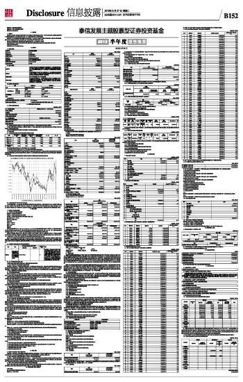 基金管理人:泰信基金管理有限公司 基金托管人:中国工商银行股份有限公司 送出日期:2013年8月27日 §1 重要提示 1.1 重要提示 基金管理人的董事会、董事保证本报告所载资料不存在虚假记载、误导性陈述或重大遗漏, 并对其内容的真实性、准确性和完整性承担个别及连带的法律责任。本半年度报告已经三分之二以上独立董事签字同意,并由董事长签发。 基金托管人中国工商银行股份有限公司根据本基金合同规定,于2013年8月20日复核了本报告中的财务指标、净值表现、利润分配情况、财务会计报告、投资组合报告等内容,保证复核内容不存在虚假记载、误导性陈述或者重大遗漏。 基金管理人承诺以诚实信用、勤勉尽责的原则管理和运用基金资产,但不保证基金一定盈利。 基金的过往业绩并不代表其未来表现。投资有风险,投资者在作出投资决策前应仔细阅读本基金的招募说明书及其更新。 本报告中财务资料未经审计。 本报告期自2013年1月1日起至6月30日止。 §2 基金简介 2.1 基金基本情况 ■ 2.2 基金产品说明 ■ 2.3 基金管理人和基金托管人 ■ 2.4信息披露方式 ■ §3 主要财务指标和基金净值表现 3.1 主要会计数据和财务指标 金额单位:人民币元 ■ 注:1、所述基金业绩指标不包括持有人申购或交易基金的各项费用,计入费用后实际收益水平要低于所列数字。 2、本期已实现收益指基金本期利息收入、投资收益、其他收入(不含公允价值变动收益)扣除相关费用后的余额,本期利润为本期已实现收益加上本期公允价值变动收益。 3、期末可供分配利润是指未分配利润与未分配利润中已实现部分的孰低数。 3.2 基金净值表现 3.2.1 基金份额净值增长率及其与同期业绩比较基准收益率的比较 ■ 注:本基金的业绩比较基准为:75%×沪深300指数+25%×中证全债指数 1、沪深300指数,编制合理和透明,运用广泛,对中国A股市场具有较强的代表性和权威性。 2、中证全债指数以银行间市场和沪深交易所市场的国债、金融债券及企业债券为样本,是综合反映银行间债券市场和沪深交易所债券市场的跨市场债券指数,具有良好的债券市场代表性,运用较为广泛。选择该业绩比较基准能够真实反映本基金长期动态的资产配置目标和风险收益特征。 3.2.2 自基金合同生效以来基金份额累计净值增长率变动及其与同期业绩比较基准收益率变动的比较 ■ 注:1、本基金基金合同于2010年12月15日正式生效。 2、本基金的建仓期为六个月。建仓期满,基金投资组合各项比例符合基金合同的约定。本基金将基金资产的60%-95%投资于股票,基金资产的5%-40%投资于债券、现金类资产及权证、资产支持证券。其中,现金或到期日在1年以内的政府债券不低于基金资产净值的5%,权证不高于基金资产净值的3%,资产支持证券不高于基金资产净值的20%。其中投资于发展主题相关上市公司的比例不低于股票投资资产的80%。 §4 管理人报告 4.1 基金管理人及基金经理情况 4.1.1 基金管理人及其管理基金的经验 基金管理人:泰信基金管理有限公司 注册地址:上海市浦东新区浦东南路256号37层 办公地址:上海市浦东新区浦东南路256号华夏银行大厦36、37层 成立日期:2003 年 5 月 23日 法定代表人:葛航(代任) 总经理:葛航 电话:021-20899188 传真:021-20899008 联系人:庄严 发展沿革: 泰信基金管理有限公司(First-Trust Fund Management Co.,Ltd.)是山东省国际信托投资有限公司(现更名为山东省国际信托有限公司)联合江苏省投资管理有限责任公司、青岛国信实业有限公司共同发起设立的基金管理公司。公司于2002 年9 月24 日经中国证券监督委员会批准正式筹建,2003 年5 月8 日获准开业,是以信托投资公司为主发起人而发起设立的基金管理公司。 公司目前下设市场部、营销部(分华东、华北、华南三大营销中心和电子商务部)、客服中心、基金投资部、研究部、专户投资部、理财顾问部、清算会计部、信息技术部、风险管理部、监察稽核部、计划财务部、综合管理部、北京分公司、深圳分公司。截至2013年6月,公司有正式员工111人,多数具有硕士以上学历。所有人员在最近三年内均未受到所在单位及有关管理部门的处罚。 截至2013年6月,泰信基金管理有限公司旗下共有泰信天天收益货币、泰信先行策略混合、泰信双息双利债券、泰信优质生活股票、泰信优势增长混合、泰信蓝筹精选股票、泰信债券增强收益、泰信发展主题股票、泰信债券周期回报、泰信中证200指数、泰信中小盘精选股票、泰信保本混合、泰信中证基本面400指数分级、泰信现代服务业股票共14只开放式基金及泰信财富分级5号、泰信恒益高息债分级共2个资产管理计划。 4.1.2 基金经理(或基金经理小组)及基金经理助理简介 ■ 注:1、以上日期均是指公司公告的日期。 2、证券从业的含义遵从行业协会《证券从业人员资格管理办法》的相关规定。 4.2 管理人对报告期内本基金运作遵规守信情况的说明 本报告期内,本基金管理人严格遵循《证券投资基金法》、《证券投资基金运作管理办法》、《泰信发展主题股票型证券投资基金基金合同》和其他相关法律法规的规定,本着诚实信用、勤勉尽责、取信于市场、取信于社会的原则管理和运用基金资产。本基金管理人在严格控制风险的基础上,为基金份额持有人谋求最大利益,无损害基金份额持有人利益的行为,本基