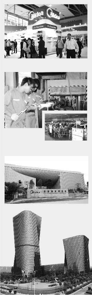 图片说明: ①美的集团产品参加展会 ②美的集团生产车间 ③美的集团线圈盘生产车间 ④美的制冷研究院 ⑤美的集团总部办公大楼