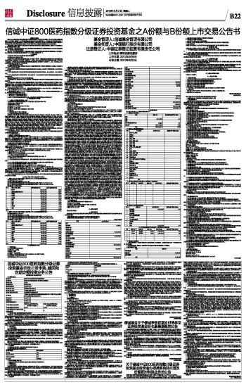 关于信诚中证800医药指数分级证券 投资基金投资者办理跨系统转托管及 份额配对转换业务的公告 信诚中证800医药指数分级证券投资基金(以下简称“本基金”)的基金合同于2013年8月16日正式生效。 根据《信诚中证800医药指数分级证券投资基金基金合同》(以下简称“基金合同”)的相关规定,本基金通过场外、场内两种方式公开发售,基金发售结束后,场外认购的全部份额将确认为信诚中证800医药指数分级证券投资基金之基础份额(场内简称:信诚医药,基金代码:165519);场内认购的全部份额将按1:1的比例确认为信诚中证800医药指数分级证券投资基金A份额(场内简称:800医药A,基金代码:150148)与信诚中证800医药指数分级证券投资基金B份额(场内简称:800医药B,基金代码:150149)。本基金合同生效后,信诚医药将接受场外与场内申购和赎回;800医药A和800医药B只上市交易,不接受申购和赎回。 为向投资者提供更优质的服务,信诚基金管理有限公司(以下简称“本公司”)决定自2013年9月4日起,开通信诚医药的跨系统转托管业务、以及信诚医药与800医药A和800医药B之间的份额配对转换业务。具体事项公告如下: 一、跨系统转托管业务 为保证基金份额持有人的利益,本基金管理人向深圳证券交易所、中国证券登记结算有限公司(以下简称“中登”)提出申请,自2013年9月4日起开通信诚医药跨系统转托管业务,通过场内、场外认购本基金的基金份额持有人自2013年9月4日起可通过办理跨系统转托管业务实现信诚医药在两个登记系统之间的转托管。在场内,800医药A和800医药B的份额持有人应将相应份额"合并转换"为信诚医药后,方可将信诚医药转托管至场外。通过场外认购取得信诚医药的份额持有人拟持有800医药A和800医药B的,需先将信诚医药通过跨系统转托管转至场内后,方可"分拆转换"为800医药A和800医药B,从而在深圳证券交易所进行上市交易。信诚医药跨系统转托管的具体业务需按照中登的相关规定办理。 二、份额配对转换业务 (一)份额配对转换是指信诚医药与800医药A和800医药B之间的配对转换,包括分拆和合并两个方面。 1. 分拆。基金份额持有人将其持有的每两份信诚医药的场内份额申请转换成一份800医药A与一份800医药B的行为。 2. 合并。基金份额持有人将其持有的每一份800医药A与一份800医药B进行配对申请转换成两份信诚医药的场内份额的行为。 信诚医药的场外份额不进行份额配对转换。在信诚医药的场外份额通过跨系统转托管至场内后,可按照份额配对转换规则进行操作。 (二)份额配对转换的业务办理机构 投资者可以通过依据中登有关规定获得业务办理资格的深圳证券交易所会员单位办理份额配对转换业务,按照中登有关规定获得业务办理资格的深圳证券交易所会员单位名单可向本公司咨询,截至2013年7月11日,具有配对转换业务资格的深圳证券交易所会员单位为:国泰君安证券、中信建投证券、国信证券、招商证券、广发证券、中信证券、银河证券、海通证券、华泰联合证券、申银万国证券、兴业证券、长江证券、安信证券、西南证券、金通证券、湘财证券、民生证券、国元证券、渤海证券、华泰证券、山西证券、中信万通证券、东兴证券、东吴证券、信达证券、东方证券、方正证券、长城证券、光大证券、广州证券、东北证券、南京证券、上海证券、新时代证券、国联证券、浙商证券、平安证券、华安证券、国海证券、财富证券、东莞证券、中原证券、国都证券、东海证券、中银国际证券、恒泰证券、国盛证券、华西证券、宏源证券、齐鲁证券、世纪证券、第一创业证券、金元证券、江南证券、华林证券、德邦证券、西部证券、广发华福证券、华龙证券、中金公司财通证券、华鑫证券、瑞银证券、中国建银投资证券、中山证券、红塔证券、西藏证券、日信证券、联讯证券、江海证券、天源证券、银泰证券、国金证券、中国民族证券、华宝证券、厦门证券、华融证券、财达证券、天风证券、大通证券、首创证券、国开证券。 (三)份额配对转换的业务办理时间 深圳证券交易所交易日上午9∶30-11∶30和下午1∶00-3∶00(基金管理人公告暂停份额配对转换业务时除外)。上述时间以外不予办理。 若深圳证券交易所交易时间更改或实际情况需要,基金管理人将对份额配对转换业务的办理时间进行相应调整并公告。 (四)份额配对转换业务办理规则 1、投资者以中登深圳分公司A股账户或证券投资基金账户(以下简称“深市证券账户”)申报份额配对转换业务中的“分拆”或“合并”指令,申报前需备足对价,即投资者提出“合并”申请时,其所申报的深市证券账户上须有足够的、可交易的800医药A和800医药B;投资者提出“分拆”申请时,其所申报的深市证券账户上须有足够的、可交易的信诚医药基金份额。 2、投资者通过业务办理机构提出份额配对转换申请的,统一以信诚医药的交易代码“165519”作为申请指令的证券代码,以份额为单位进行“合并”或“分拆”申报。 3、“合并”或“分拆”每笔申请的份额数必须是偶数,投资者在业务办理机构提交的每笔申请份额不得低于1000份。 基金管理人可根据市场情况调整“合并”或“分拆”每笔申报的最低份额数量限制,基金管理人必须在调整生效前依照有关规定进行公告。 4、办理份额配对转换业务的