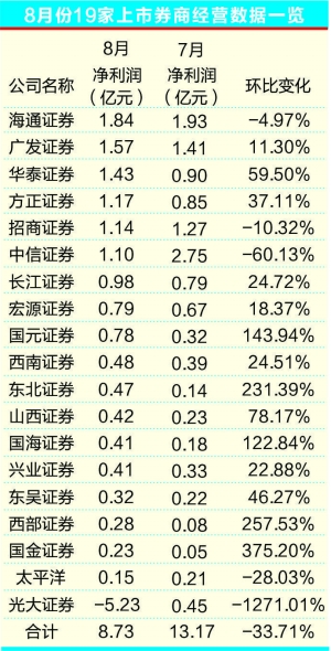 上市券商8月净利环比降逾三成剔除光大证券亏损因素,18家券商盈利略增 2013-09-11 来源:证券时报网 作者:张欣然