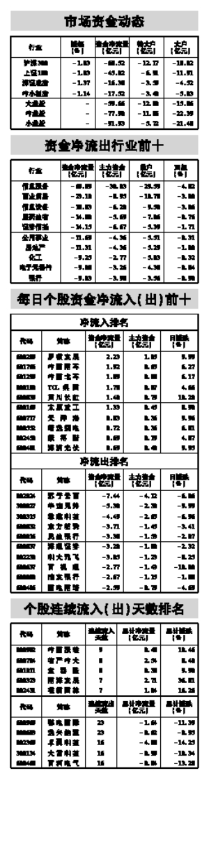 据STCN资金流向快报(http://data.stcn.com/statisticalData.shtml)数据显示,10月22日,沪深两市共流出资金229.49亿元,资金结束前一交易日的流入状态,转而流出。其中,沪市净流出107.21亿元,深市净流出122.28亿元。主力资金合计流出89.32亿元。 指数方面,上证180指数成份股资金流出45.02亿元,深证成指成份股资金流出16.38亿元,沪深300指数成份股资金流出68.52亿元。以股本规模计,流通盘中大盘股资金流出59.66亿元,中盘股资金流出77.90亿元,小盘股资金流出91.93亿元。 行业方面,按照衍生申万一级行业分类计,有2个行业资金净流入,23个行业资金净流出。其中,采掘流入资金3.80亿,成为资金最关注的行业;信息服务流出资金69.89亿,有较明显的资金出逃现象。 家用电器业已持续3个交易日净流入资金,共流入资金11.01亿,居行业连续流入天数榜首位。有色金属业已持续22个交易日净流出资金,共流出资金120.96亿,为行业连续流出天数榜第一。 中国服装已持续9个交易日净流入资金,累计流入资金0.48亿,居个股连续流入天数榜首位。郴电国际已持续23个交易日净流出资金,累计流出资金1.64亿,为个股连续流出天数榜第一。 股指期货方面,IF1311合约收报2446.00点,下跌0.89%;成交60.92万手,持仓量减1656手,收报6.86万手;资金共流出77.15亿。(黄舒欣) (本栏目数据来源:名策数据) 本版导读: