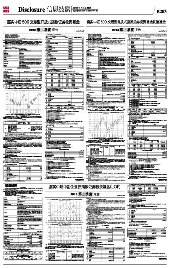基金管理人:嘉实基金管理有限公司 基金托管人:中国建设银行股份有限公司 报告送出日期:2013年10月24日 §1 重要提示 基金管理人的董事会及董事保证本报告所载资料不存在虚假记载、误导性陈述或重大遗漏,并对其内容的真实性、准确性和完整性承担个别及连带责任。 基金托管人中国建设银行股份有限公司根据本基金合同规定,于2013年10月22日复核了本报告中的财务指标、净值表现和投资组合报告等内容,保证复核内容不存在虚假记载、误导性陈述或者重大遗漏。 基金管理人承诺以诚实信用、勤勉尽责的原则管理和运用基金资产,但不保证基金一定盈利。 基金的过往业绩并不代表其未来表现。投资有风险,投资者在作出投资决策前应仔细阅读本基金的招募说明书。 本报告期中的财务资料未经审计。 本报告期自2013年7月1日起至2013年9月30日止。 §2 基金产品概况 2.1 基金产品情况 ■ 2.1.1 目标基金基本情况 ■ 2.1.2 目标基金产品说明 ■ §3 主要财务指标和基金净值表现 3.1 主要财务指标 单位:人民币元 ■ 注:(1)本期已实现收益指基金本期利息收入、投资收益、其他收入(不含公允价值变动收益)扣除相关费用后的余额,本期利润为本期已实现收益加上本期公允价值变动收益。(2)上述基金业绩指标不包括持有人认购或交易基金的各项费用,计入费用后实际收益水平要低于所列数字。 3.2 基金净值表现 3.2.1 本报告期基金份额净值增长率及其与同期业绩比较基准收益率的比较 ■ 3.2.2 自基金合同生效以来基金份额累计净值增长率变动及其与同期业绩比较基准收益率变动的比较 ■ 图:嘉实中证500ETF联接基金份额累计净值增长率与同期业绩比较基准收益率的历史走势对比图 (2013年3月22日至2013年9月30日) 注:本基金基金合同生效日2013年3月22日至报告期末未满1年。按基金合同和招募说明书的约定,本基金自基金合同生效日起3个月内为建仓期,建仓期结束时本基金的各项投资比例符合基金合同“第十二部分(二)投资范围和(七)投资限制”的有关约定。 §4 管理人报告 4.1 基金经理(或基金经理小组)简介 ■ 注:(1)任职日期是指本基金基金合同生效之日;(2)证券从业的含义遵从行业协会《证券业从业人员资格管理办法》的相关规定。 4.2 管理人对报告期内本基金运作遵规守信情况的说明 报告期内,本基金管理人严格遵循了《证券法》、《证券投资基金法》及其各项配套法规、《嘉实中证500交易型开放式指数证券投资基金联接基金基金合同》和其他相关法律法规的规定,本着诚实信用、勤勉尽责的原则管理和运用基金资产,在严格控制风险的基础上,为基金份额持有人谋求最大利益。本基金运作管理符合有关法律法规和基金合同的规定和约定,无损害基金份额持有人利益的行为。 4.3 公平交易专项说明 4.3.1 公平交易制度的执行情况 报告期内,基金管理人严格执行证监会《证券投资基金管理公司公平交易制度指导意见》和公司内部公平交易制度,各投资组合按投资管理制度和流程独立决策,并在获得投资信息、投资建议和实施投资决策方面享有公平的机会;通过完善交易范围内各类交易的公平交易执行细则、严格的流程控制、持续的技术改进,确保公平交易原则的实现;通过IT系统和人工监控等方式进行日常监控,公平对待旗下管理的所有投资组合。 4.3.2 异常交易行为的专项说明 报告期内,本基金未发生异常交易行为。 4.4 报告期内基金的投资策略和业绩表现说明 4.4.1 报告期内基金投资策略和运作分析 本报告期内,本基金日均跟踪误差为0.04%,年度化拟合偏离度为0.63%,符合基金合同约定的日均跟踪误差不超过0.35%的限制。 4.4.2 报告期内基金的业绩表现 截至本报告期末本基金份额净值为1.1114元;本报告期基金份额净值增长率为18.07%,业绩比较基准收益率为18.65%。 4.5 管理人对宏观经济、证券市场及行业走势的简要展望 本基金为目标ETF 的联接基金。主要通过投资于目标ETF 实现对业绩比较基准的紧密跟踪,本基金将在严守基金合同及相关法律法规要求的前提下,继续秉承指数化投资管理策略,积极应对基金申购赎回等因素对指数跟踪效果带来的冲击,进一步降低基金的跟踪误差,力求获得与目标ETF所跟踪的标的指数相近的平均收益率。 §5 投资组合报告 5.1 报告期末基金资产组合情况 ■ 5.2 报告期末按行业分类的股票投资组合 ■ 5.3 报告期末按公允价值占基金资产净值比例大小排序的前十名股票投资明细 ■ 5.4 报告期末按债券品种分类的债券投资组合 报告期末,本基金未持有债券。 5.5 报告期末按公允价值占基金资产净值比例大小排名的前五名债券投资明细 报告期末,本基金未持有债券。 5.6 报告期末按公允价值占基金资产净值比例大小排名的前十名资产支持证券投资明细 报告期末,本基金未持有资产支持证券。 5.7 报告期末按公允价值占基金资产净值比例大小排名的前五名权证投资明细 报告期末,本基金未持有权证。 5.8 期末投资目标基金明细 ■ 注:2013年9月30日、10月8日,因投资者连续申购本基金,被动导致本基金持有的嘉实中证500ETF市值占基金资产净值的比例低于90%,10月9日已调整至90%以上。 5.9 报告期末本基金投资的股指期货交易情况说明 报告期内,本基金未参与股指期货交易。 5.10 报告期末本基金投资的国债期货交易情况说明 报告期内,本基