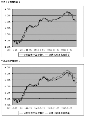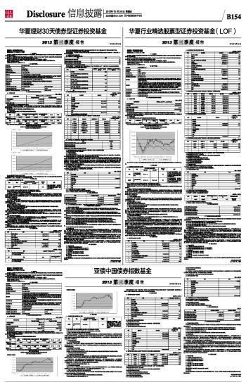 基金管理人:华夏基金管理有限公司 基金托管人:交通银行股份有限公司 报告送出日期:二〇一三年十月二十四日 §1 重要提示 基金管理人的董事会及董事保证本报告所载资料不存在虚假记载、误导性陈述或重大遗漏,并对其内容的真实性、准确性和完整性承担个别及连带责任。 基金托管人交通银行股份有限公司根据本基金合同规定,于2013年10月22日复核了本报告中的财务指标、净值表现和投资组合报告等内容,保证复核内容不存在虚假记载、误导性陈述或者重大遗漏。 基金管理人承诺以诚实信用、勤勉尽责的原则管理和运用基金资产,但不保证基金一定盈利。 基金的过往业绩并不代表其未来表现。投资有风险,投资者在作出投资决策前应仔细阅读本基金的招募说明书。 本报告中财务资料未经审计。 本报告期自2013年7月1日起至9月30日止。 §2 基金产品概况 ■ §3 主要财务指标和基金净值表现 3.1 主要财务指标 单位:人民币元 ■ 注:①所述基金业绩指标不包括持有人认购或交易基金的各项费用,计入费用后实际收益水平要低于所列数字。 ②本期已实现收益指基金本期利息收入、投资收益、其他收入(不含公允价值变动收益)扣除相关费用后的余额,本期利润为本期已实现收益加上本期公允价值变动收益。 3.2 基金净值表现 3.2.1 基金份额净值增长率及其与同期业绩比较基准收益率的比较 华夏亚债中国指数A: ■ 华夏亚债中国指数C: ■ 3.2.2 自基金合同生效以来基金份额累计净值增长率变动及其与同期业绩比较基准收益率变动的比较 亚债中国债券指数基金 份额累计净值增长率与业绩比较基准收益率历史走势对比图 (2011年5月25日至2013年9月30日) 华夏亚债中国指数A ■ 华夏亚债中国指数C ■ §4 管理人报告 4.1 基金经理(或基金经理小组)简介 ■ 注:①上述任职日期、离任日期根据本基金管理人对外披露的任免日期填写。 ②证券从业的含义遵从行业协会《证券业从业人员资格管理办法》的相关规定。 4.2 管理人对报告期内本基金运作遵规守信情况的说明 本报告期内,本基金管理人严格遵守《中华人民共和国证券投资基金法》、《证券投资基金运作管理办法》、《证券投资基金管理公司公平交易制度指导意见》、《基金管理公司开展投资、研究活动防控内幕交易指导意见》、基金合同和其他有关法律法规,本着诚实信用、勤勉尽责、安全高效的原则管理和运用基金资产,在严格控制投资风险的基础上,为基金份额持有人谋求最大利益,没有损害基金份额持有人利益的行为。 4.3 公平交易专项说明 4.3.1 公平交易制度的执行情况 本基金管理人一贯公平对待旗下管理的所有基金和组合,制定并严格遵守相应的制度和流程,通过系统和人工等方式在各环节严格控制交易公平执行。报告期内,本公司严格执行了《证券投资基金管理公司公平交易制度指导意见》和《华夏基金管理有限公司公平交易制度》的规定。 4.3.2 异常交易行为的专项说明 报告期内未发现本基金存在异常交易行为。 报告期内,未出现涉及本基金的交易所公开竞价同日反向交易成交较少的单边交易量超过该证券当日成交量5%的情况。 4.4 报告期内基金的投资策略和业绩表现说明 4.4.1 报告期内基金投资策略和运作分析 3季度,国际方面,发达经济体保持了温和复苏的态势,其中美国经济趋势向好,其货币政策动向格外牵动市场的神经。国内方面,经济仍存在惯性的下行压力,但补库存的短期动力支撑了经济小幅反弹,反弹的持续性还有待观察。 由于供求不平衡,一方面,金融机构的去杠杆导致长期债券的购买方需求不足;另一方面,国债金融债大量发行,一级市场招标利率持续高于预期,并与二级市场形成恶性循环,此外,经济企稳反弹也一定程度导致利率上行,报告期内利率债出现了较大幅度调整,10年期国债收益率上升接近50bp,历史上类似幅度的调整仅出现在高通胀阶段。 报告期内,本基金组合久期与基准指数久期基本一致。 4.4.2 报告期内基金的业绩表现 截至2013年9月30日,华夏亚债中国指数A基金份额净值为1.032元,本报告期份额净值增长率为-2.55%;华夏亚债中国指数C基金份额净值为1.023元,本报告期份额净值增长率为-2.57%,同期业绩比较基准增长率为-1.69%。 4.5 管理人对宏观经济、证券市场及行业走势的简要展望 4季度,经济反弹走势可能会在年末打破,基本面有利于债市企稳;但是资金面不确定性增加,美国量化宽松退出节奏、外汇占款和央行对冲力度等变数增加,紧平衡格局较难打破。 基于以上判断,4季度利率债市场有望企稳反弹,而资金面变数则是其主要风险因素。 本基金将继续保持组合久期与基准指数久期一致。 珍惜基金份额持有人的每一分投资和每一份信任,本基金将继续奉行华夏基金管理有限公司“为信任奉献回报”的经营理念,规范运作,审慎投资,勤勉尽责地为基金份额持有人谋求长期、稳定的回报。 §5 投资组合报告 5.1 报告期末基金资产组合情况 金额单位:人民币元 ■ 5.2 报告期末按行业分类的股票投资组合 本基金本报告期末未持有股票。 5.3 报告期末按公允价值占基金资产净值比例大小排序的前十名股票投资明细 本基金本报告期末未持有股票。 5.4 报告期末按债券品种分类的债券投资组合 金额单位:人民币元 ■ 5.5 报告期末按公允价值占基金资产净值比例大小排名