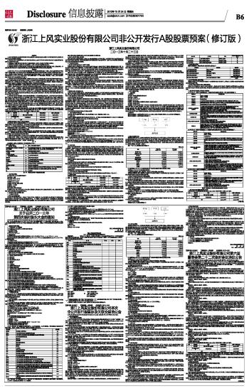 证券代码:000967 证券简称:上风高科 公告编号:2013-037 浙江上风实业股份有限公司第六届 董事会第二十二次临时会议决议公告 本公司及董事会全体成员保证信息披露的内容真实、准确、完整,没有虚假记载、误导性陈述或重大遗漏。 浙江上风实业股份有限公司(以下简称“公司”或“本公司”)于2013年10月16日以通讯方式向董事会全体成员发出了召开公司第六届董事会第二十二次临时会议的通知。会议于2013年10月23日下午14时在广东威奇电工材料有限公司会议室召开,会议由董事长何剑锋先生主持。本次会议应参与表决董事7名,实际参与表决董事 7 名,会议召开及决策程序符合《中华人民共和国公司法》及《公司章程》的有关规定。 经各位董事认真审议,形成如下决议: 一、逐项审议通过《关于公司2013年度非公开发行A股股票发行方案(修订版)的议案》,并提交股东大会审议; 公司第六届董事会第二十次临时会议审议通过了《关于公司2013年度非公开发行A股股票发行方案的议案》,鉴于公司本次非公开发行募集资金拟收购资产涉及的审计和评估工作已经完成以及公司2012年度利润分配方案实施完毕,现公司对非公开发行股票方案进行了部分修订。董事会逐项审议了《关于公司2013年度非公开发行A股股票发行方案(修订版)的议案》,具体如下: 1、本次发行股票种类和面值: 本次非公开发行的股票种类为境内上市的人民币普通股(A股),每股面值人民币1.00元。 表决结果: 4票赞成,0票反对,0票弃权。 2、发行方式: 本次发行采取非公开发行的方式。公司将在中国证监会核准后6个月内选择适当时机向不超过十名特定对象发行A股股票。 表决结果: 4票赞成,0票反对,0票弃权。 3、发行数量: 根据公司第六届董事会第二十次临时会议决议,本次非公开发行A股股票数量不超过7,800万股(含7,800万股),在上述范围内,根据本次非公开发行相关审计评估结果结合募集资金需求,本次非公开发行的数量调整为不超过6,800万股(含6,800万股)。在该范围内,董事会将提请股东大会授权董事会根据实际情况与保荐机构(主承销商)协商确定最终发行数量。若公司在本次发行定价基准日至发行期首日之间发生派发股利、送红股、转增股本等除息、除权行为,本次发行数量将作相应调整。2013年6月28日,公司完成了2012年度利润分配,向全体股东每10股派发现金红利0.20元(含税),同时以资本公积金向全体股东每10股转增2股,根据上述规则,除权除息后,本次非公开发行数量相应调整为不超过8,200万股(含8,200万股)。 表决结果: 4票赞成,0票反对,0票弃权。 4、发行对象及认购方式: 本次发行对象为包括盈峰投资控股集团有限公司(以下简称“盈峰控股”)、曹国路先生在内的不超过十名特定对象。其中,盈峰控股承诺以不低于9,000万元且不超过15,000万元的现金进行认购本次非公开发行的股份;曹国路承诺以不低于7,300万元且不超过10,000万元的现金进行认购本次非公开发行的股份,并且认购后持股比例低于上市公司本次非公开发行后总股本的5%。盈峰投资控股集团有限公司及曹国路先生均不参与本次发行的询价,其认购价格按照与其他发行对象相同的价格进行认购。其他发行对象范围为符合中国证监会规定的证券投资基金管理公司、证券公司、信托投资公司、财务公司、保险机构投资者、合格境外机构投资者以及其他机构投资者、自然人等。 具体发行对象将在取得发行核准批文后,根据发行对象申购报价的情况,遵照价格优先原则确定。所有发行对象均以现金方式认购本次发行的股票。 表决结果: 4票赞成,0票反对,0票弃权。 5、定价方式: 本次非公开发行的定价基准日为公司第六届第二十次临时董事会决议公告日,本次发行价格不低于定价基准日前20个交易日公司股票均价的 90%(定价基准日前20个交易日股票交易均价=定价基准日前20个交易日股票交易总额/定价基准日前20个交易日股票交易总量),即6.42元/股。在本次发行定价基准日至发行日期间,若公司发生派发股利、送红股或资本公积转增股本等除权、除息事项,发行价格将作出相应调整。 2013年6月28日,公司完成了2012年度利润分配,向全体股东每10股派发现金红利0.2元(含税),同时以资本公积金向全体股东每10股转增2股,因此除权除息后,本次非公开发行价格相应调整为不低于5.33元/股。 最终发行价格将在取得发行核准批文后,由公司董事会根据股东大会的授权,根据有关法律、行政法规及其他规范性文件的规定及市场情况,并根据发行对象申购报价的情况,遵照价格优先原则,与本次发行的保荐机构(主承销商)协商确定。 表决结果: 4票赞成,0票反对,0票弃权。 6、锁定期: 盈峰控股、曹国路先生承诺,自本次非公开发行股票结束之日起 36个月内不转让其本次认购的公司非公开发行股份。其余发行对象认购公司本次非公开发行的股份自发行结束之日起12个月内不得转让。 表决结果: 4票赞成,0票反对,0票弃权。 7、上市地点: 在锁定期满后,本次非公开发行的股票将在深圳证券交易所上市交易。 表决结果: 4票赞成,0票反对,0票弃权。 8、募集资金数额及用途: 本次非公开发行预计募集资金总额不超过43,525.15万元(含发行费用),拟投入如下项目: ■ 若本次非公开发行实际募集资金净额少于上述项目拟投入募集资金总额,募集资金不足部分由公司自筹解决;募集资