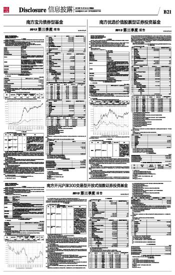 基金管理人:南方基金管理有限公司 基金托管人:中国工商银行股份有限公司 报告送出日期:2013年10月24日 §1 重要提示 基金管理人的董事会及董事保证本报告所载资料不存在虚假记载、误导性陈述或重大遗漏,并对其内容的真实性、准确性和完整性承担个别及连带责任。 基金托管人中国工商银行股份有限公司根据本基金合同规定,于2013年10月21日复核了本报告中的财务指标、净值表现和投资组合报告等内容,保证复核内容不存在虚假记载、误导性陈述或者重大遗漏。 基金管理人承诺以诚实信用、勤勉尽责的原则管理和运用基金资产,但不保证基金一定盈利。基金的过往业绩并不代表其未来表现。投资有风险,投资者在作出投资决策前应仔细阅读本基金的招募说明书。 本报告财务资料未经审计。 本报告期自2013年7月1日起至2013年9月30日止。 §2 基金产品概况 ■ 注:本基金在交易所行情系统净值揭示等其他信息披露场合下,可简称为“南方300”。 §3 主要财务指标和基金净值表现 3.1 主要财务指标 单位:人民币元 ■ 注:1.本期已实现收益指基金本期利息收入、投资收益、其他收入(不含公允价值变动收益)扣除相关费用后的余额,本期利润为本期已实现收益加上本期公允价值变动收益。 2.所述基金业绩指标不包括持有人认购或交易基金的各项费用,计入费用后实际收益水平要低于所列数字。 3.2 基金净值表现 3.2.1 本报告期基金份额净值增长率及其与同期业绩比较基准收益率的比较 ■ 3.2.2 自基金合同生效以来基金累计净值增长率变动及其与同期业绩比较基准收益率变动的比较 ■ 注:1、本基金转型日期为2013年2月18日,截止报告期末,本基金转型后基金合同生效未满一年。 2、本基金合同中关于基金投资比例的约定:在建仓完成后,本基金投资于标的指数成份股、备选成份股的资产比例不低于基金资产净值的95%,权证、股指期货及其他金融工具的投资比例依照法律法规或监管机构的规定执行。本基金的建仓期为3个月,建仓期结束时各项资产配置比例符合基金合同约定。 §4 管理人报告 4.1 基金经理(或基金经理小组)简介 ■ 注:1.此处的任职日期指公司做出决定之日。 2.证券从业的含义遵从行业协会《证券业从业人员资格管理办法》的相关规定。 4.2 管理人对报告期内本基金运作遵规守信情况的说明 本报告期内,本基金管理人严格遵守《中华人民共和国证券投资基金法》、《证券投资基金运作管理办法》、《证券投资基金销售管理办法》和《证券投资基金信息披露管理办法》等有关法律法规及各项实施准则、《南方开元沪深300交易型开放式指数证券投资基金基金合同》和其他有关法律法规的规定,本着诚实信用、勤勉尽责的原则管理和运用基金资产,在严格控制风险的基础上,为基金持有人谋求与标的指数相近的收益。本报告期内,基金运作整体合法合规,没有损害基金持有人利益。基金的投资范围、投资比例及投资组合符合有关法律法规及基金合同的规定。 4.3 公平交易专项说明 4.3.1 公平交易制度的执行情况 本报告期内,本基金管理人严格执行《证券投资基金管理公司公平交易制度指导意见》,完善相应制度及流程,通过系统和人工等各种方式在各业务环节严格控制交易公平执行,公平对待旗下管理的所有基金和投资组合。 4.3.2 异常交易行为的专项说明 本基金于本报告期内不存在异常交易行为。本报告期内基金管理人管理的所有投资组合参与的交易所公开竞价同日反向交易成交较少的单边交易量超过该证券当日成交量的5%的交易次数为3次,是由于指数型基金根据标的指数成份股结构被动调仓所致。 4.4 报告期内基金的投资策略和业绩表现说明 4.4.1 报告期内基金投资策略和运作分析 报告期内,我国各项经济指标均出现环比回暖,经济再次复苏。同期沪深300指数上涨9.47%。 期间我们通过自建的“指数化交易系统”、“日内择时交易模型”、“跟踪误差归因分析系统”、“ETF现金流精算系统”等,将本基金的跟踪误差指标控制在较好水平,并通过严格的风险管理流程,确保了本ETF基金的安全运作。 我们对本基金报告期内跟踪误差归因分析如下: ① 大额申购赎回带来的成份股权重偏差,对此我们通过日内择时交易争取跟踪误差最小化; ② 个别长期停牌证券,引起的成份股权重偏离及基金整体仓位的微小偏离; ③ 6月底前后,我们根据指数每半年度成份股调整进行了基金调仓,事前我们制定了详细的调仓方案,在实施过程中引入多方校验机制防范风险发生,从实施结果来看,效果良好,跟踪误差控制在理想范围内。 4.4.2 报告期内基金的业绩表现 自本基金上市以来至报告期末年化跟踪误差为0.581%,较好的完成了基金合同中控制年化跟踪误差不超过2%的投资目标。 截至报告期末,本基金份额净值为0.9375元,报告期内, 份额净值增长率为10.40%,同期业绩基准增长率为9.47%。 §5 投资组合报告 5.1 报告期末基金资产组合情况 ■ 5.2 报告期末按行业分类的股票投资组合 5.2.1 报告期末指数投资按行业分类的股票投资组合 ■ 5.2.2 报告期末积极投资按行业分类的股票投资组合 本基金本报告期末未持有积极投资。 5.3 报告期末按公允价值占基金资产净值比例大小排序的前十名股票投资明细 5.3.1 报告期末指数投资按公允价值占基金资产净值比例大小排序的前十