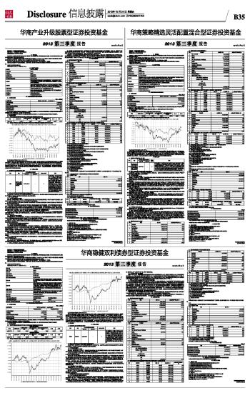 基金管理人:华商基金管理有限公司 基金托管人:中国民生银行股份有限公司 报告送出日期:2013年10月24日 §1 重要提示 基金管理人的董事会及董事保证本报告所载资料不存在虚假记载、误导性陈述或重大遗漏,并对其内容的真实性、准确性和完整性承担个别及连带的法律责任。 基金托管人中国民生银行股份有限公司根据本基金合同规定,于2013年10月23日复核了本报告中的财务指标、净值表现和投资组合报告等内容,保证复核内容不存在虚假记载、误导性陈述或者重大遗漏。 基金管理人承诺以诚实信用、勤勉尽责的原则管理和运用基金资产,但不保证基金一定盈利。 基金的过往业绩并不代表其未来表现。投资有风险,投资者在作出投资决策前应仔细阅读本基金的招募说明书及其更新。 本报告中财务资料未经审计。 本报告期自2013年7月1日起至9月30日止。 §2 基金产品概况 ■ §3 主要财务指标和基金净值表现 3.1 主要财务指标 单位:人民币元 ■ 注:①本期已实现收益指基金本期利息收入、投资收益、其他收入(不含公允价值变动收益)扣除相关费用后的余额,本期利润为本期已实现收益加上本期公允价值变动收益。 ②所述基金业绩指标不包括持有人认购或交易基金的各项费用,计入费用后实际收益水平要低于所列数字。 3.2 基金净值表现 3.2.1 本报告期基金份额净值增长率及其与同期业绩比较基准收益率的比较 ■ 3.2.2 自基金合同生效以来基金累计净值增长率变动及其与同期业绩比较基准收益率变动的比较 ■ 注:①本基金合同生效日为2010年11月9日。 ②根据《华商策略精选灵活配置混合型证券投资基金基金合同》的规定,本基金主要投资于具有良好流动性的金融工具,包括国内依法发行上市的股票、债券、货币市场工具、权证、资产支持证券以及法律法规或中国证监会允许基金投资的其他金融工具。本基金的投资组合比例为:股票投资比例占基金资产的30%-80%,债券投资比例占基金资产的15%-65%,权证投资比例占基金资产净值的0%-3%,并保持不低于基金资产净值5%的现金或到期日在一年以内的政府债券。根据基金合同的规定,自基金合同生效之日起6个月内基金各项资产配置比例需符合基金合同要求。本基金在建仓期结束时,各项资产配置比例符合基金合同有关投资比例的约定。 §4 管理人报告 4.1 基金经理(或基金经理小组)简介 ■ 4.2 管理人对报告期内本基金运作遵规守信情况的说明 在本报告期内,基金管理人不存在损害基金份额持有人利益的行为。基金管理人勤勉尽责地为基金份额持有人谋求利益,严格遵守了《基金法》及其他有关法律法规、基金合同的规定。 4.3 公平交易专项说明 4.3.1 公平交易制度的执行情况 报告期内,本基金管理人严格执行了《证券投资基金管理公司公平交易制度指导意见》和公司内部公平交易制度,在研究分析、投资决策、交易执行等各个环节,公平对待旗下所有投资组合。 公司建立投研管理平台并定期举行投研晨会、投研联席会等,建立健全投资授权制度,确保各投资组合公平获得研究资源,享有公平的投资决策机会。 针对公司旗下所有投资组合的交易所公开竞价交易,通过交易系统中的公平交易程序,对于不同投资组合同日同向买卖同一证券的指令自动进行比例分配,报告期内,系统的公平交易程序运作良好,未出现异常情况。针对场外网下交易业务,公司依照《证券投资基金管理公司公平交易制度指导意见》和公司内部场外、网下交易业务的相关规定,确保各投资组合享有公平的交易执行机会。对于以公司名义进行的交易严格按照发行分配的原则或价格优先、比例分配的原则在各投资组合间进行分配。本报告期内,场外、网下业务公平交易制度执行情况良好,未出现异常情况。 公司对旗下各投资组合的交易行为进行监控和分析,对各投资组合不同时间窗口(1日、3日、5日)内的同向交易的溢价金额与溢价率进行了T检验,统计了溢价率占优比例。本报告期内,未出现违反公平交易制度的情况,公司旗下各基金不存在利益输送的行为。 4.3.2 异常交易行为的专项说明 为规范投资行为,公平对待投资组合,公司制定了《异常交易管理办法》,对包括可能显著影响市场价格、可能导致不公平交易、可能涉嫌利益输送等异常交易行为做出了界定及相应的防范、控制措施。 报告期内严格执行公司相关制度,未发现本基金存在异常交易行为。公司严格控制旗下非指数型投资组合参与交易所公开竞价同日反向交易,按照有关指数的构成比例进行的投资导致出现的同日反向交易中,成交较少的单边交易量均未超过该证券当日成交量的5%。 4.4 报告期内基金的投资策略和业绩表现说明 4.4.1 报告期内基金投资策略和运作分析 三季度国内经济平稳,实体经济并未出现明显的复苏,加之美国QE退出预期增强,基本面和流动性层面都不支撑市场出现大规模的系统性行情,市场整体表现平稳。但是随着三中全会的临近,市场对改革的预期不断增强,结构性行情愈演愈烈,一方面受益制度改革的“土改”、“金改”等方向的主题板块大幅上涨,另一方面符合经济转型方向的消费、传媒、信息服务等新兴行业也表现较好。我们认为2013年是中国改革的重要一年,传统经济发展模式在经历了近十年的大跃进之后,不得不面临产能过剩、环境制约、人口红