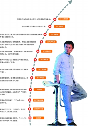 编者按:对于渴望从金融业分得一杯羹的互联网企业来说,阿里巴巴堪称“金融业的探路先锋”,但在传统金融业者看来,阿里巴巴和他背后的马云又是金融业的“搅局者”,甚至是金融业门外的“野蛮人”。 从开展网络小贷业务开始,阿里巴巴隔三差五就会挑动传统金融企业和监管机构的神经。阿里巴巴从第三方支付,再到小额信贷、担保、保险,再到收购基金公司,除了吸储,阿里巴巴的触角已伸向了传统商业银行所涉及的绝大部分领域。阿里还想做什么?这是传统金融业猜不透的谜。