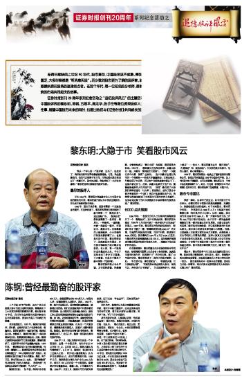 在资讯稀缺的上世纪90年代,股市草创,中国股民还不成熟,得到资讯的渠道也非常匮乏,大多时候都是“听消息买股”。而少数对股市更为了解的股评家,就成为为股民答疑解惑提供资讯服务的迷津指点者。在那个年代,每一位知名的分析师,都曾有过与那个激情燃烧的市场共同起伏的故事。 证券时报创刊20周年系列纪念活动之“追忆股评风云”的主题活动昨日举行,曾叱咤中国股评界的黎东明、陈钢、古思平、周龙华、张子任等数位资深股评人士汇集一堂,在回首往事,展望中国股市未来的同时,也道出他们与《证券时报》共同成长的深厚渊源……
