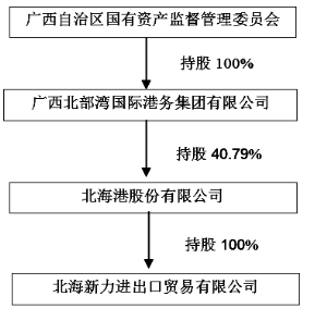 证券代码:000582 证券简称:北 海 港 公告编号:2013028 北海港股份有限公司 为全资子公司贸易融资提供担保公告 本公司及董事会保证信息披露内容的真实、准确、完整,没有虚假记载、误导性陈述或重大遗漏。 一、担保情况概述 协议签署日期、签署地点:尚未签订 被担保人名称:北海新力进出口贸易有限公司 债权人名称:兴业银行股份有限公司北海分行、中信银行南宁分行、中国建设银行股份有限公司北海分行等金融机构 担保金额:总额不超过3亿元人民币 董事会审议担保议案的表决情况:公司第六届董事会第二十一次会议于2013年10月24日召开,会议以8票同意,0票反对,0票弃权,审议通过了《关于为全资子公司新力贸易公司贸易融资提供担保的议案》。 交易生效所必需的审议或审批程序:根据深交所《股票上市规则》,本项担保经股东大会审议批准后签订协议生效。 二、被担保人基本情况 1.被担保人的名称:北海新力进出口贸易有限公司 成立日期:1993年3月6日 注册地点:北海市海角路145号 法定代表人:甘宏亮 注册资本:2000万元 主营业务:自营和代理各类商品和技术的进出口;经营进料加工和“三来一补业务”;经营对销贸易和转口贸易;煤炭经营等 与公司存在的关联关系或其他业务联系:北海新力贸易公司是本公司全资子公司,本项担保不构成关联交易。 2.被担保人相关的产权及控制关系结构图 ■ 3.被担保人北海新力贸易公司一年又一期主要财务指标和最新的信用等级状况 单位:万元