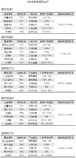 ●该组合收益仍然受债市波动影响,申万收益也会加大收益率波动。并且,流动性存在一定风险,如博时裕祥B流动性较差,常年日成交量160万左右。 (好买财富) NO.5 ●该组合属所有组合中最激进的。组合想利用分级债基进取份额,搭配相应比例的优先份额,可还原一只普通债基,采用其他高到期收益的优先份额,获取超额收益。然而,裕祥B杠杆很高,以目前的状态,相当于一个“可套利的普通债基”,与固定收益组合目标有偏离。(好买财富)