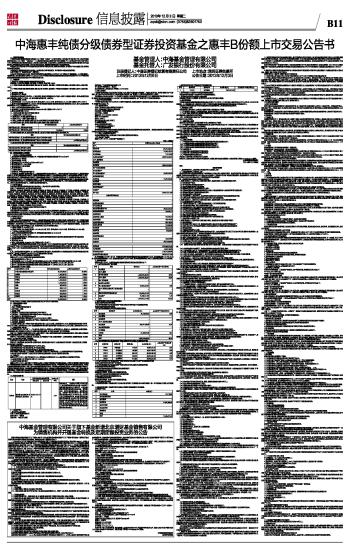 一、 重要声明与提示 中海惠丰纯债分级债券型证券投资基金(以下简称“本基金”)之惠丰B份额上市交易公告书依据《中华人民共和国证券投资基金法》(以下简称“《基金法》”)、《证券投资基金信息披露内容与格式准则第1号<上市交易公告书的内容与格式>》和《深圳证券交易所证券投资基金上市规则》的规定编制,本基金管理人的董事会及董事保证本报告所载资料不存在虚假记载、误导性陈述或者重大遗漏,并对其内容的真实性、准确性和完整性承担个别及连带责任。 本基金托管人保证本公告书中基金财务会计资料等内容的真实性、准确性和完整性,承诺其中不存在虚假记载、误导性陈述或者重大遗漏。 中国证监会、深圳证券交易所对本基金上市交易及有关事项的意见,均不表明对本基金的任何保证。 本公告书第七节“基金财务状况”未经审计。 凡本公告书未涉及的有关内容,请投资者详细查阅本基金管理人2013年8月13日刊登在《中国证券报》、《上海证券报》、《证券时报》及本基金管理人网站(www.zhfund.com)的《中海惠丰纯债分级债券型证券投资基金招募说明书》和《中海惠丰纯债分级债券型证券投资基金基金合同》等相关法律文件。 二、 基金概览 1、基金名称:中海惠丰纯债分级债券型证券投资基金 基金简称:中海惠丰分级债券;场内简称:中海惠丰;基金代码:163909 (1)中海惠丰纯债分级债券型证券投资基金之惠丰A份额,基金简称:中海惠丰分级债券A;场内简称:惠丰A;基金代码:163910 (2)中海惠丰纯债分级债券型证券投资基金之惠丰B份额,基金简称:中海惠丰分级债券B;场内简称:惠丰B;基金代码:150154 2、基金类型:债券型 3、基金运作方式:契约型 本基金基金合同生效后,每2年为一个运作周期,按运作周期滚动的方式运作。在每个分级运作周期内,惠丰A份额自分级运作周期起始日起每6个月开放一次,惠丰B份额封闭运作并上市交易。 4、基金存续期限:不定期 5、基金份额总额:1,181,285,097.30份,其中,惠丰A为821,167,901.82份,惠丰B为360,117,195.48份(截至2013年11月29日) 6、惠丰B的基金份额参考净值:0.955元(中海惠丰纯债分级债券型证券投资基金份额净值为0.993元,惠丰A的基金份额参考净值为1.010元,数据截至2013年11月29日) 7、本次上市交易的基金份额场内简称:惠丰B 8、惠丰B本次上市交易的基金份额总额:35,489,309.00份(截至2013年11月29日) 9、惠丰B的交易代码:150154 10、上市交易的证券交易所:深圳证券交易所 11、上市交易日期:2013年12月6日 12、基金管理人:中海基金管理有限公司 13、基金托管人:广发银行股份有限公司 14、本次上市交易的基金份额注册登记机构:中国证券登记结算有限责任公司 15、本公司基金从业人员持有基金份额的总量及占该只基金总份额的比例