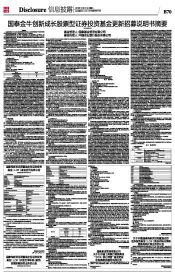 注:1、本基金募集期间的信息披露费、会计师费、律师费以及其他费用,不从基金财产中列支。 2、本基金管理人高级管理人员、基金投资和研究部门负责人认购本基金份额总量的数量区间为0至10万份(含);本基金的基金经理未认购本基金份额。 3、本基金场外认购的基金份额确认为649,390,113.53份,场内认购的基金份额确认为839,155,153.00份。 3.其他需要提示的事项 自基金合同生效之日起,本基金管理人正式开始管理本基金。 基金份额持有人可以到销售机构的网点查询交易确认情况,也可以通过本基金管理人的网站(www.gtfund.com)或客户服务电话(400-888-8688)查询交易确认情况。 本基金的申购、赎回业务自基金合同生效之日起不超过3个月开始办理。在确定申购开始与赎回开始时间后,基金管理人应在申购、赎回开放日前依照《信息披露办法》的有关规定在指定媒体上公告申购与赎回的开始时间。 在符合法律法规和深圳证券交易所规定的上市条件的情况下,本基金将于基金合同生效后3个月内开始在深圳证券交易所上市交易。在确定上市交易的时间后,基金管理人将依据法律法规规定在指定媒体上刊登基金份额上市交易公告书。 风险提示:基金管理人依照恪尽职守、诚实信用、谨慎勤勉的原则管理和运用基金财产,不保证投资本基金一定盈利,也不保证基金份额持有人的最低收益。敬请投资人注意投资风险。投资人投资于上述基金前应认真阅读基金的基金合同、更新的招募说明书。 特此公告。 国泰基金管理有限公司 二零一三年十二月三十一日 国泰淘新灵活配置混合型证券投资 基金(LOF)开放日常申购、赎回、 定期定额投资业务的公告 公告送出日期:2013年12月31日 1.公告基本信息