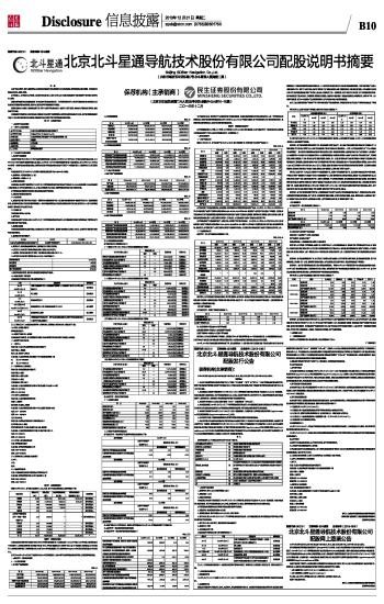 声 明 本公司全体董事、监事、高级管理人员承诺本配股说明书及其摘要不存在任何虚假、误导性陈述或重大遗漏,并保证所披露信息的真实、准确、完整。 公司负责人、主管会计工作负责人及会计机构负责人(会计主管人员)保证本配股说明书及其摘要中财务会计报告真实、完整。 证券监督管理机构及其他政府部门对本次发行所做的任何决定,均不表明其对发行人所发行证券的价值或者投资人的收益作出实质性判断或者保证。任何与之相反的声明均属虚假不实陈述。 根据《证券法》的规定,证券依法发行后,发行人经营与收益的变化,由发行人自行负责,由此变化引致的投资风险,由投资者自行负责。 本配股说明书摘要的目的仅为向公众提供有关本次发行的简要情况。投资者在做出认购决定之前,应仔细阅读配股说明书全文,并以其作为投资决定的依据。配股说明书全文同时刊登于深圳证券交易所网站。 第一节 本次发行概况 一、本次发行的基本情况 (一)发行人的基本情况 | 1、公司中文名称: | 北京北斗星通导航技术股份有限公司 | | 2、公司英文名称: | Beijing BDStar Navigation Co.,Ltd. | | 3、注册地址: | 北京市海淀区丰贤东路7号北斗星通大厦南楼二层 | | 4、法定代表人: | 周儒欣 | | 5、股票简称: | 北斗星通 | | 6、股票代码: | 002151 | | 7、上 市 地: | 深圳证券交易所 |