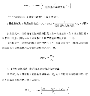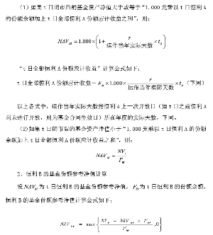 (上接B10版) 三、恒利A、恒利B基金份额收益分配规则 1、恒利A的约定年基准收益率 恒利A 根据基金合同的规定获取约定收益,其约定年基准收益率将在每个开放日重新设定一次并按照《信息披露办法》有关规定及基金合同的约定进行相关公告。计算公式为: 恒利A 份额的约定年基准收益率=1.4×人民币一年期银行定期存款利率 恒利A份额根据基金合同的约定获取约定收益,其基准收益率将在每个开放日设定一次并公告。恒利A份额的约定年基准收益率为 “1.4×人民币一年期银行定期存款利率”。在基金合同生效日当日,基金管理人将根据届时中国人民银行执行的金融机构人民币一年期银行定期存款基准利率设定恒利A份额的首次约定年基准收益率,该收益率即为恒利A基金合同生效后最初6个月的年收益率,适用于基金合同生效日(含)到第1个开放日(含)的时间段; 在恒利A份额的每个开放日(最后1个开放日除外),基金管理人将根据该日中国人民银行执行的金融机构人民币一年期银行定期存款基准利率重新设定恒利A的年收益率,该收益率即为恒利A接下来6个月的年收益率,适用于该开放日(不含)到下个开放日(含)的时间段;在恒利A的最后1个开放日,基金管理人将根据该日中国人民银行执行的金融机构人民币1年期银行定期存款基准利率重新设定恒利A的年收益率,该收益率适用于该开放日(不含)到基金合同生效后3年期届满日(含)的时间段。 基金管理人可以根据市场情况,保留将恒利A份额的约定年基准收益率在此基础上上调不超过20%的权利。 恒利A份额的基金份额净值以基金合同生效日或开放日恒利A折算后的1元(即恒利A的本金)为基准采用约定年基准收益率单利进行计算。 如届时法律法规及其他规定对1年期银行存款利息征收利息税,则恒利A的年收益率的计算公式中“1年期银行定期存款利率”指征税后的利率。例如:假设某一开放日中国人民银行公布的1年期银行定期存款利率为3%,利息税为5%,则1年期银行定期存款利率为3%×(1-5%)=2.85%。 基金管理人并不承诺或保证恒利A份额的本金安全或约定收益,在极端亏损的情况下,恒利A份额的持有人可能面临无法足额取得约定收益乃至本金损失的风险。 2、恒利B的收益分配 本基金的净资产将优先支付恒利A的本金及约定收益,在扣除恒利A的应计收益后的全部剩余收益归恒利B享有。如本基金的净资产等于或低于恒利A的本金及其约定应得收益的总额,则本基金净资产全部分配予恒利A后,仍存在额外未弥补的恒利A本金及约定收益总和的差额,则不再进行弥补。 四、基金份额发售 恒利A、恒利B将分别通过各自销售机构的销售网点独立进行公开发售。 五、本基金的基金份额净值计算 本基金的基金份额净值计算公式如下: T日基金份额净值=T日闭市后的基金资产净值/T日基金份额的余额数量 本基金基金合同生效之日起3年内,T日基金份额的余额数量为恒利A和恒利B的份额总额;本基金基金合同生效后3年期满并转为上市开放式基金(LOF)后,T日基金份额的余额数量为该LOF基金的份额总额。本基金基金份额净值的计算,保留到小数点后3位,小数点后第4位四舍五入,由此产生的误差计入基金财产。 T日的基金份额净值在当天收市后计算,并在T+1日内公告。如遇特殊情况,经中国证监会同意,可以适当延迟计算或公告。 六、恒利A和恒利B的基金份额参考净值计算 本基金基金合同生效后3年期内,基金管理人在计算基金资产净值的基础上,采用“虚拟清算”原则分别计算并公告恒利A和恒利B的基金份额参考净值,其中恒利A的基金份额参考净值计算日不包括恒利A的开放日。基金份额参考净值是对两级基金份额价值的一个估算,并不代表基金份额持有人可获得的实际价值。 1、恒利A的基金份额参考净值计算 本基金基金合同生效后3年期内,在恒利A的非开放日(t日),设@为自恒利A上一次开放日(如t日之前恒利A尚未进行开放,则为基金合同生效日)至t日的运作天数,NVt为t日闭市后的基金资产净值,@为t日恒利A的份额余额,@为t日恒利A的基金份额参考净值,r为在恒利A上一次开放日(如t日之前恒利A尚未进行开放,则为基金合同生效日)设定的恒利A的年收益率。 ■ 恒利A、恒利B的基金份额参考净值的计算,保留到小数点后3位,小数点后第4位四舍五入,由此产生的误差计入基金财产。 t日的恒利A和恒利B的基金份额参考净值在当天收市后计算,并在t+1日内公告。如遇特殊情况,经中国证监会同意,可以适当延迟计算或公告。 七、恒利A与恒利B开放日基金份额净值的计算 1、恒利A开放日基金份额净值的计算 本基金基金合同生效后,截止恒利A的某一开放日或者恒利B的封闭期届满日(T日),设Ta为自恒利A上一次开放日(如T日之前恒利A尚未进行开放,则为基金合同生效日)至T日的运作天数,NVT为T日闭市后的基金资产净值,FaT为T日恒利A的份额余额,NAVaT为T日恒利A的基金份额净值,r为在恒利A上一次开放日(如T日之前恒利A尚未进行开放,则为基金合同生效日)设定的恒利A的年收益率。 (1)如果T日闭市后的基金资产净值大于或等于“1.000元乘以T日恒利A的份额余额加上T日全部恒利A份额应计收益之和”,则: ■ 恒利A、恒利B的基金份额净值的计算,保留到小数点后8位,小数点后第9位四舍五入,由此产生的误差计入基金财产。 八、恒利A与恒利B基金份额净值的公告 本基金基金合同生效