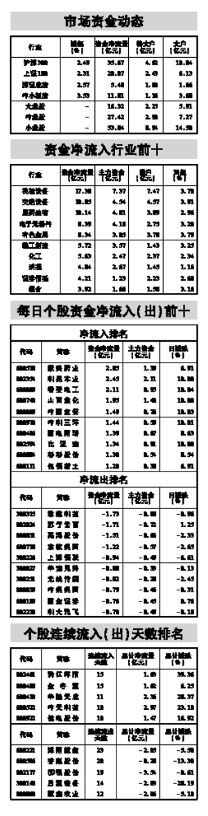 据STCN资金流向快报(http://data.stcn.com/statisticalData.shtml)数据显示,2月10日,沪深两市共流入资金97.59亿元,连续第2个交易日净流入。其中,沪市净流入47.26亿元,深市净流入50.33亿元。主力资金合计流入41.76亿元。 指数方面,上证180指数成份股资金流入20.07亿元,深证成指成份股资金流入5.48亿元,沪深300指数成份股资金流入35.67亿元。以股本规模计,流通盘中大盘股资金流入16.32亿元,中盘股资金流入27.42亿元,小盘股资金流入53.84亿元。 行业方面,按照衍生申万一级行业分类计,有24个行业资金净流入,1个行业资金净流出。其中,机械设备流入资金17.38亿,成为资金最关注的行业;信息服务流出资金6.76亿,有较明显的资金出逃现象。 交运设备业已持续4个交易日净流入资金,共流入资金17.36亿,居行业连续流入天数榜首位。 珠江啤酒已持续15个交易日净流入资金,累计流入资金1.63亿,居个股连续流入天数榜首位。海南航空已持续23个交易日净流出资金,累计流出资金2.05亿,为个股连续流出天数榜第一。 股指期货方面,IF1402合约收报2260.40点,上涨2.16%;成交58.66万手,持仓量减2813手,收报6.74万手;资金共流入56.00亿。(黄舒欣) (本栏目数据来源:名策数据) 本版导读: