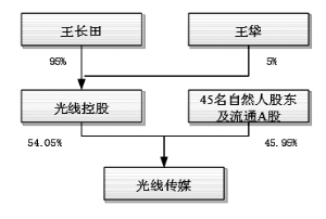 第一节 信息披露义务人介绍 一、光线传媒的基本情况 (一)光线传媒概况 公司名称:北京光线传媒股份有限公司 注册地址:北京市东城区和平里东街11号37号楼11105号 成立时间:2000年04月24日 法定代表人:王长田 注册资本:50,635.2万元 公司类型:其他股份有限公司(上市) 注册号:110000001302829 组织机构代码:72260486-9 税务登记号码:110101722604869 经营范围:许可经营项目:广播电视节目的制作、发行;经营演出及经济业务。一般经营项目:设计、制作、代理、发布国内及外商来华广告;信息咨询(除中介除外);承办展览展示;组织文化艺术交流活动;技术开发;技术服务。 经营期限:2000年04月24日至长期 通讯地址:北京市东城区和平里东街11号3号楼3层 光线传媒的控股股东为上海光线投资控股有限公司(以下简称“光线控股”),光线控股持有光线传媒54.05%的股份;王长田持有光线控股95%股权,是光线传媒的实际控制人。光线传媒的股权结构如下图所示: ■ (二)光线传媒的董事及主要负责人的基本情况
